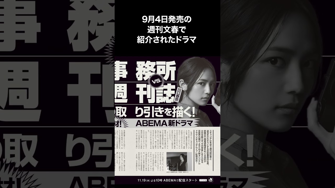 週刊文春に新ドラマの取材記事が掲載。 毎週のように話題になる芸能人の スキャンダル。その舞台裏では週慣士と 芸能事務所の私裂な工房が繰り広げられて いるとのこと。9月4日発売の週刊文春で 紹介されたドラマスキャンダルイブは そんな芸能界の闇に切り込む社会派 サスペンスドラマだ。芸能事務所の社長崎 を柴崎校がスキャンダルを大き者平たを 川口は春奈が演じる。本作は芸能 スキャンダルの裏側。そして芸能界の深い 闇へと切り込んでいく作品だ。11月19 日、安倍まで配信される。
