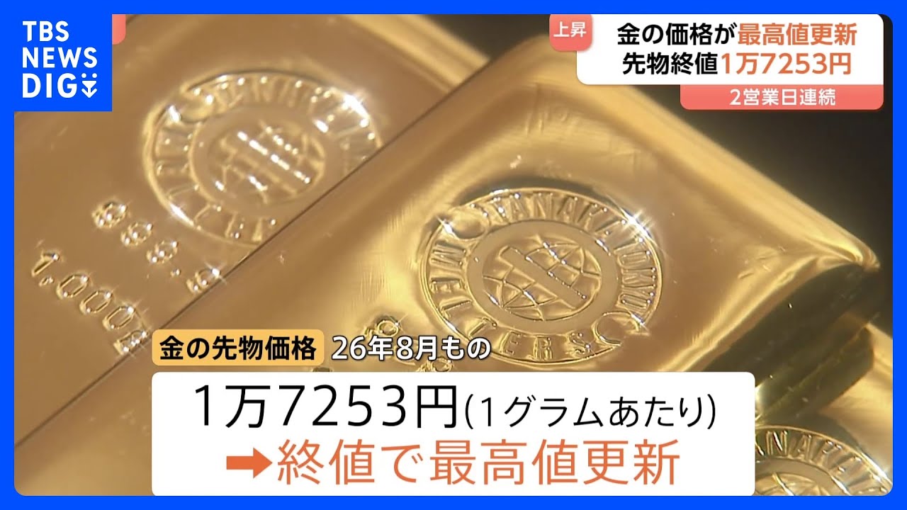 大阪取引所で取引されている金の先物価格は先週末に比べて165円上昇し、1グラムあたり1万7253円と終値として2営業日連続で最高値を更新しました。
