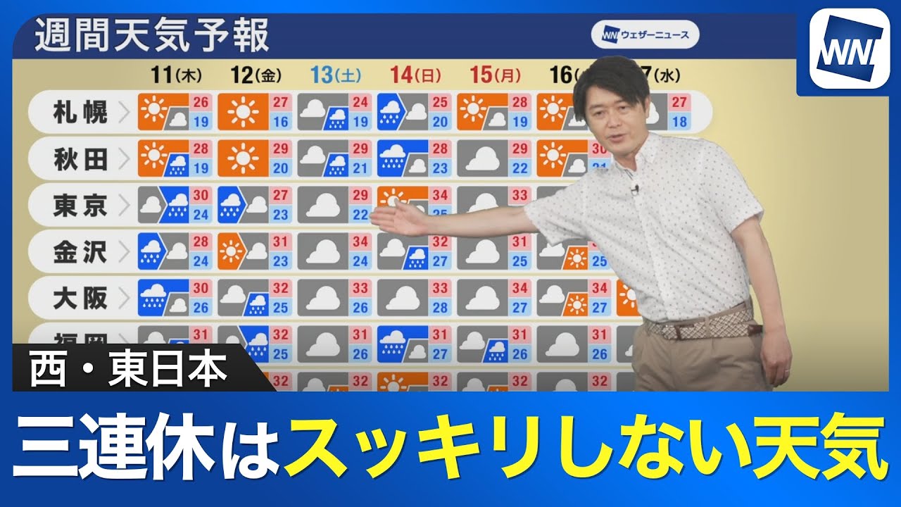 え、週間のお天気をお伝えします。この後 週末にかけては曇りや雨のすっきりしない お天気となるところが多くなりそうです。 お天気アイコン見ていきますとこの後 今週末3連休となってきますけれども、え 、西日本、東日本を中心に曇りや雨の すっきりしないお天気となります。え、 秋雨前線の影響受けそうです。また、え、 13日土曜日になってきますと、秋雨前線 上の低気圧が発達をしながら北日本に 近づいてきます。このため土曜日、日曜日 と北日本では荒れ田となってくる可能性も ありますので注意が必要です。また、え、 週開けていきますと東の方から太平洋圧が 勢力を強めていきますので、日差しの ところが多くなってきそうです。え、気温 について見ていきますと、高い日が多く なってきそうです。え、東京の気温日中の 最高気温30°を超える日もありまして、 え、14日曜日34°の予想となってい ます。え、朝晩日中ともに気温の高い状況 が続きます。え、しっかりとした熱中症 対策引き続きお願いします。え、最新の長 情報はウェザーニュースのアプリから確認 いただきます。