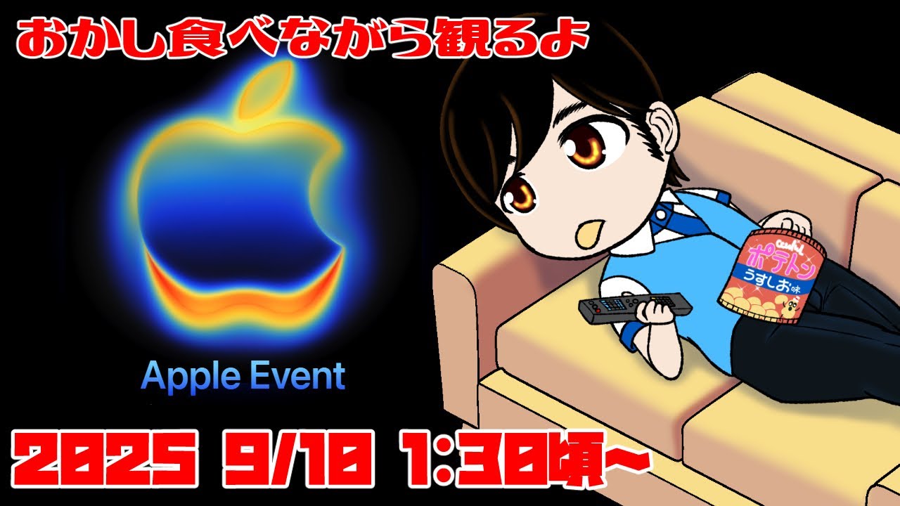 [音楽] よいしょ。こんばんは。 お待たせしました。 よいしょ。始まってる。 [音楽] はい。 えっと、 いや、この枠ね、この今のこの枠始められ ないと思ったら前の前の枠切ってなかった 。 はい。 よっしゃ。 あ、そうだ。Apple、Appleの 公式サイトと YouTubeのURL確か貼ってないよ な、まだ。ちょっと貼っとくわ。 えっと。 [音楽] [音楽] コメントと 概要欄に貼っとくあ。 [音楽] [音楽] [音楽] [音楽] [音楽] はい。で、 えっと、 [音楽] 僕はいつもiPadに 、えっと、ホームページを流して [音楽] [音楽] ここで始まるんよな。で、エアPを準備し て 待機 で画面が一応 ブリスた。 あ。 [音楽] よし。お菓子。 お菓子を お皿に開けとこう。 よいしょ。今からちょっとバリバリって袋 破る音が発生しますがご容赦ください。 はい。皆さんもね、ご飯、ご飯じゃない。 お菓子とコーラの準備をして、え、 Appleの発表会に備えてください。 [音楽] [音楽] やあ、 粉が、粉が お菓子の粉 [音楽] [音楽] [音楽] [音楽] [音楽] 今日はバームロールも買ってきたからな。 僕の好きなお菓子トップ3 ワームロールも買ってきた。 [音楽] はい。 でね、数種類の複数種類のお菓子をあの、 大きいお皿があるんだけど、なんかサラダ とか入れてね、あの、食べるような大きい お皿があるんだけど、あの、その中に 一食端にバーっと入れて足でつまんで 食べる。 [音楽] あ、皆さんもあ、アンケート出しとく。 [音楽] [音楽] [音楽] はい。iPhone17Aって本当に来る と思う? [音楽] フリング。フリングスいいね。 僕は僕はチップス系はカラムムーチョンに しました。 [音楽] あの、Lサイズ、Lサイズの 、Lサイズの あのカラムムーチョがなんか安かったから 買ってきた。通常版。通常版買うより安、 いい感じがしたから買ってきた。多分多分 安いと思う。 エアってのが知らないんですよ。あ、マジ で結構噂されてるんすよ。 薄い、薄いiPhone。 [音楽] あと10分か。やっぱコーラはコーラ2時 になってから開けよっか。あ、どうしよう かな。なんか飲みたいけど。 [音楽] あとiPhone以外にもなんか発表来る かな? iPadは来ないと思うのね。iPadは iPadは多分春だから [音楽] なんかホームとかさ、なんかその辺のが 来るんじゃない? Macminニiとか [音楽] あまあでもMacBook系もあるかな MacBook系って大体いつ発表され るっけ? [音楽] 9月10日。あ、今日モンストの日か。 モンストなんかやらなきゃいけないのある かな?あ、そっか。運曲作っとかなきゃ あんのか。 イベント、イベント クエストの [音楽] ひろさん、こんばんは。いらっしゃいませ 。 ま、でもセブンティンエアさ、 どういう層に刺さるんだろう? [音楽] ま、値段、値段設定によるよね。 Appleがどの辺の枠に収めようとして くるのか。やっぱ無印よりも高いんだよね 。やっぱ どうなんだろう。 はい。一応ね、えっと、概要欄の方に、ま 、あの、コメント、チャット欄にもね、 チャット欄にもあの打ったは打ったんだ けど、あの、概要欄に、えっと、 Appleの公式ホームページと AppleのYouTube、公式 YouTubeチャンネルのURL貼っ てるんで、ま、どっちかから見るようにし てください。 僕はあの、ホームページの方からいつも見 てます。あの、字幕が出るんで。 YouTubeも字幕出るかな? 以前はね、YouTubeで日本語の字幕 が出なかったのね。だからあの公式ホーム ページの方で僕見てるんだけどいつも [音楽] あと5分でございます。 [音楽] [音楽] [音楽] で、ま、価格が発表されて、まあ翌日以降 だとは思うんだけど、明日、ま、明日って いうか寝てね、寝て明日ね、ま、正確には 今日か、今日の夜とか、ま、明日にかけで 、 明日っていうのは、えっと、明後日の話ね 。 あの、 多分 各キャリアの価格も出揃うと思うんで。 で、えっと、今んところ楽天、楽天で僕 買おうとしてるんだけど、端末をね、 楽天で、えっと、価格が出たら、えっと、 iPhone16シリーズと17の値段を チェックします。 あの、ソフトバンクではもう買えないんで 、 ソフトバンクで買おうと思ったらソフト バンクで回線契約しなきゃいけない らしくって、唯一回線契約なくっても4年 契約、2年返却の残載0になるやつが楽天 だけできるらしくって、 端末だけ買うやつね。でも今回の17発売 に伴って使用が変更する可能性もまだね、 ワンチャンあるから。ま、でもそうなっ たらワンチャンもう今の日本通信Sから えっと楽天モバイルにまた暗返します。 僕ねと日本通信指問ね行ったり来たりし てるんだけど はい。もう間もなく3分、2分。あと2分 。 [音楽] [音楽] [音楽] [音楽] ま、今、今ここリスナーさんとして来て くださってる方がいつも来てくださってる 方 だけではないと思って話しかけるんだけど 、iPhone17、17シリーズ買う人 います?無印かま、エアが出るとしたら エアかプロか [音楽] 。 うん。どうやら、どうやらいつも来てくれ 、いつも来てくれてる人たちらしいね。 よし、あと1分。あれ?ALEのホーム ページの方がちょっと切り替わらないんだ けど。