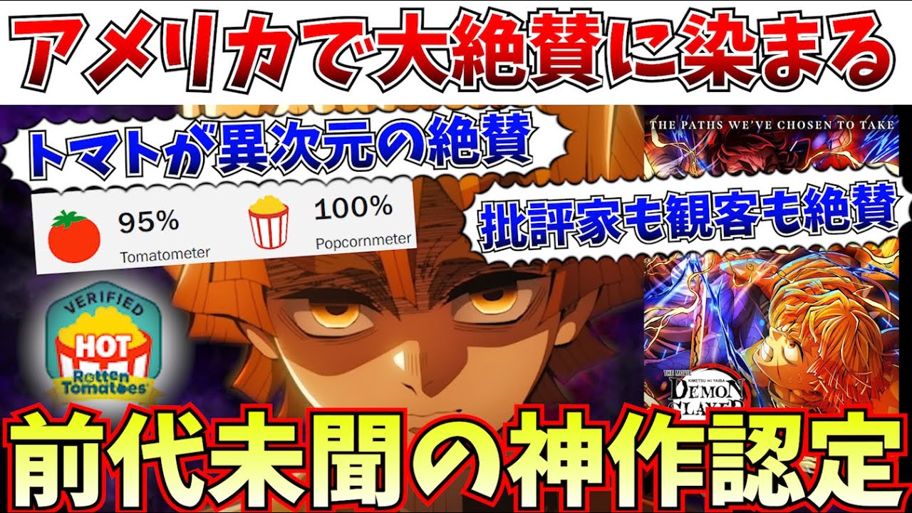 分離主義勢力の諸君ご機嫌よ。行かれた 動画にようこそここは地獄だ。さて今回の 日産はだな。ついに全米でも鬼滅の刃無限 上編第1章の先行上映が行われ散らかし、 その評価がとんでもないことに なり散らかしている件についてこのIQ 3頂の俺様が語っていこうと思うぞ。お前 ら耳の穴っぽじれ一体全体何がどうなって いるのかというとだな。まず初めに鬼滅の 刃無限上編が公開されてからすでに2ヶ月 近くが経過しているよな。しかしまだまだ 話題は尽きないどころか世界的に言えば ここからが本番とも言えるだろう。ここ までの鬼滅ムーブメントはあくまで余だ。 以前から繰り返し言わせてもらっていたの だが世界的には9月からが本番。うん。 ここからアジワを飛び越え世界中で公開さ れていくからな。そしてついにその時が来 ちまった。鬼滅の刃無限上編がついに昨日 アメリカでプレミア上映が行われた。 そんな中でついに6天トマトの評価こいつ も明らかとなった。なんと観客評価は 100%ともはやわけのわからないレベル の大絶さとなってしまった。ま、その後だ 。レビュー数が重なっていくにつれて評価 は下がっていくとは思う。なぜなら 100%なのでこれ以上上がらないから 物理的に下がるしかないからだ。現状維持 をし続けるという説もあるがさすがにそれ は不可能だと思われるとはいえだ100% デビューということは90%台が維持さ れるのはもはや確定的と言えるだろう。 ここで明確にだ。何が起きたと思う?鬼滅 の刃無限上編はアメリカの観客に受け入れ られたと言っていいだろう。いや、 受け入れられたなんて言葉では控えめだよ な。めちゃめちゃ大絶賛されている。これ 以上ないというぐらい大絶賛されている。 そういう認識で問題ない。だって100% デビューだぞ。こっからどんだけ下がって も90%台は確定的なんだから、これは大 絶賛で受け入れられた以外の表現はない だろう。 続いて非化のスコアだ。ああ、よくあるよ な。観客からは絶賛されてるけど、非評価 からはボロカス言われる作品。あ、鬼滅の 刃もなんかそうなるんじゃないかなと思っ ているやつも中にはいると思う。しかし 安心してくれ。非評価のスコアだがこちら は95% となっている。俺が以前言ったようにだ。 やはり評価スコアも高くなったな。いや、 高くなるとは確かに言っていたよ、俺。 スコアも絶対高くなるって言ってたんだ けれども、さすがに90%後半は予想して なかったな。これにて鬼滅の刃だ。非評価 からも観客からも大絶賛された映画となっ た。この天トマトにおける圧倒的な絶賛は 確実に多くの観客の背中を押すことになる だろう。鬼滅の刃の無限上編か。見に 行こっかな。見に行かないかなと思ってい た奴らの背中をめちゃめちゃ力強く行け お前と押した結果になるはずだ。この トマトにおける圧倒的な絶賛評価。うん。 これがイコールで必ずヒットにつがると いうわけではないのだが正直これの影響力 は無視できない。とんでもなくされてこけ た映画もあるし、反対にとんでもなく絶賛 されて集客につがった映画もある。ここ まで絶賛一食になっている場合は確実に プラスの効果があるだろう。ま、とはいえ だ、そもそも一定以上の注目度がないと 打席にすら立てない。これはある。しかし 幸いなことに鬼滅の刃無限上編にはそれに 相応の注目度がある状態なんだよな。もう 分かるだろ。こんだけね、世界中で話題に なってるっていう話を散々俺今までしてき たよな。多分累計で言ったら1時間以上し てると思うぞ。だから多分西チには十分 伝わっていると思うのだが鬼滅の刃無限 上編にはちゃんとした注目度がある。その 上でこれだけ絶賛されたんだ。これが何を 意味するのか分かるだろ?もう勝ち確だ。 全米における1億ドル突破。これが ますます現実身を帯びてきたな。初集1位 は確定だろう。もう確定だ。100%確定 だと俺は思っている。うーん。いよいよ 伝説の幕明けだ。言っただろ?以前から 言っていたよな。あくまで今の段階、 アジア県内でめちゃめちゃヒットしている 段階はあくまで第1波だ。第2波が9月 から来る。そう言ったよな。そして先行 上映の時点でこの有様だ。ああ、そうだ。 もう分かっただろ。ここからが本番だ。 うわ。さて、ここから先は行かれた レビューを紹介していこう。お前らに シチルの呼吸を使え。行くぞ。 ラビューだ。まずは観客レビューから紹介 だ。お前ら気を取り直していくぞ。すま ない。少しテンションがぶち上がりすぎた ようだ。気を取り直そう。1回深呼吸する んだ。いいか?まずは観客レビューから 紹介しましょう。まずはラジオネーム レックスさんからのお便りです。鬼滅の刃 は息を飲むような戦闘シーンと魅惑的な ストーリーラインが完璧に融合しています 。アニメーションは最高レベルで全ての 戦闘シーンは金迫感と美しさに満ち、登場 人物たちの感情の深さが物語を記憶に残る ものにしています。最初から最後まで決索 