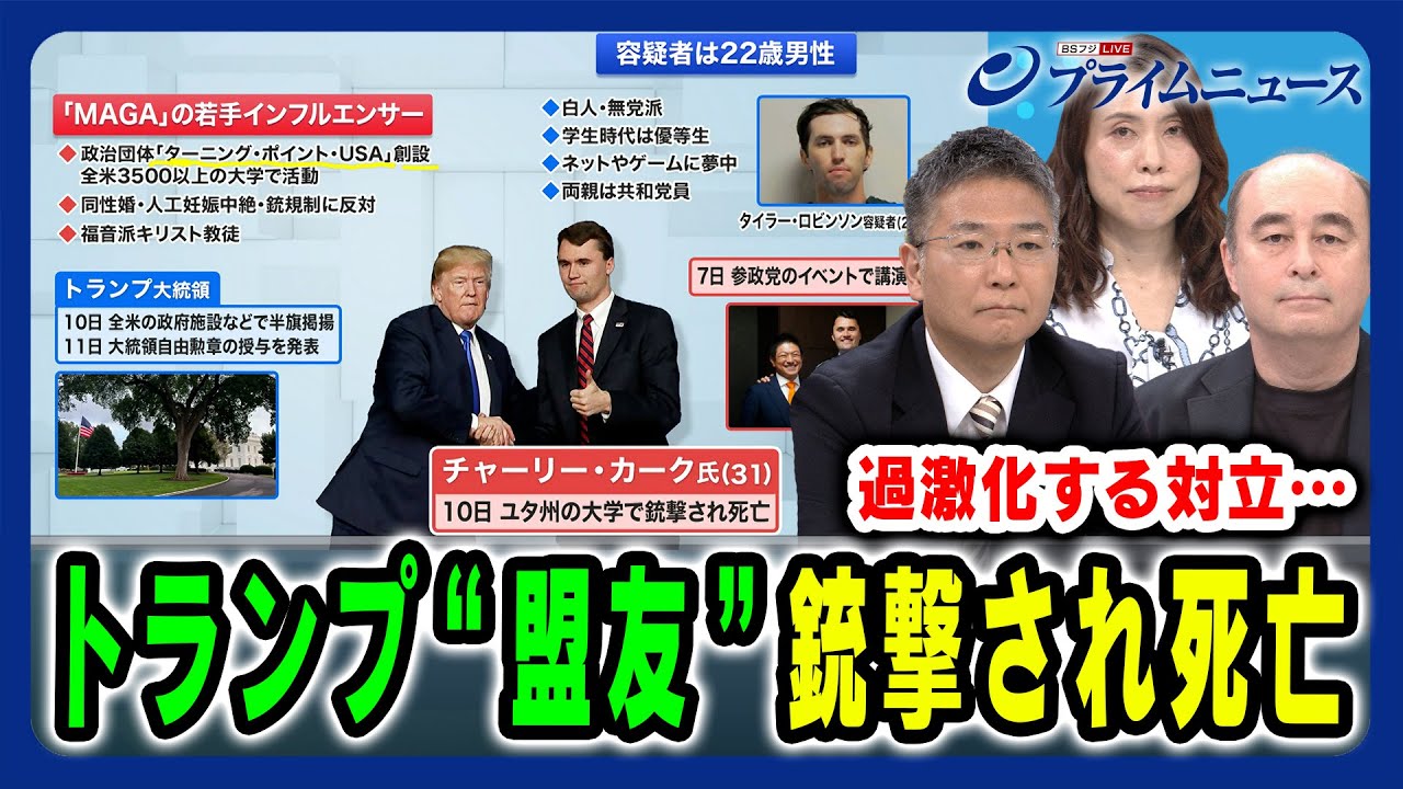 米西部ユタ州でトランプ大統領の“盟友”と評される保守系の政治活動家、チャーリー・カーク氏(31)が銃撃され死亡。トランプ大統領はSNSでコメントを出し、全米の政府施設などで米国旗の半旗掲揚を命じる布告に署名した。カーク氏は7日に都内で講演しており、日本国内でも衝撃が広がっている。
