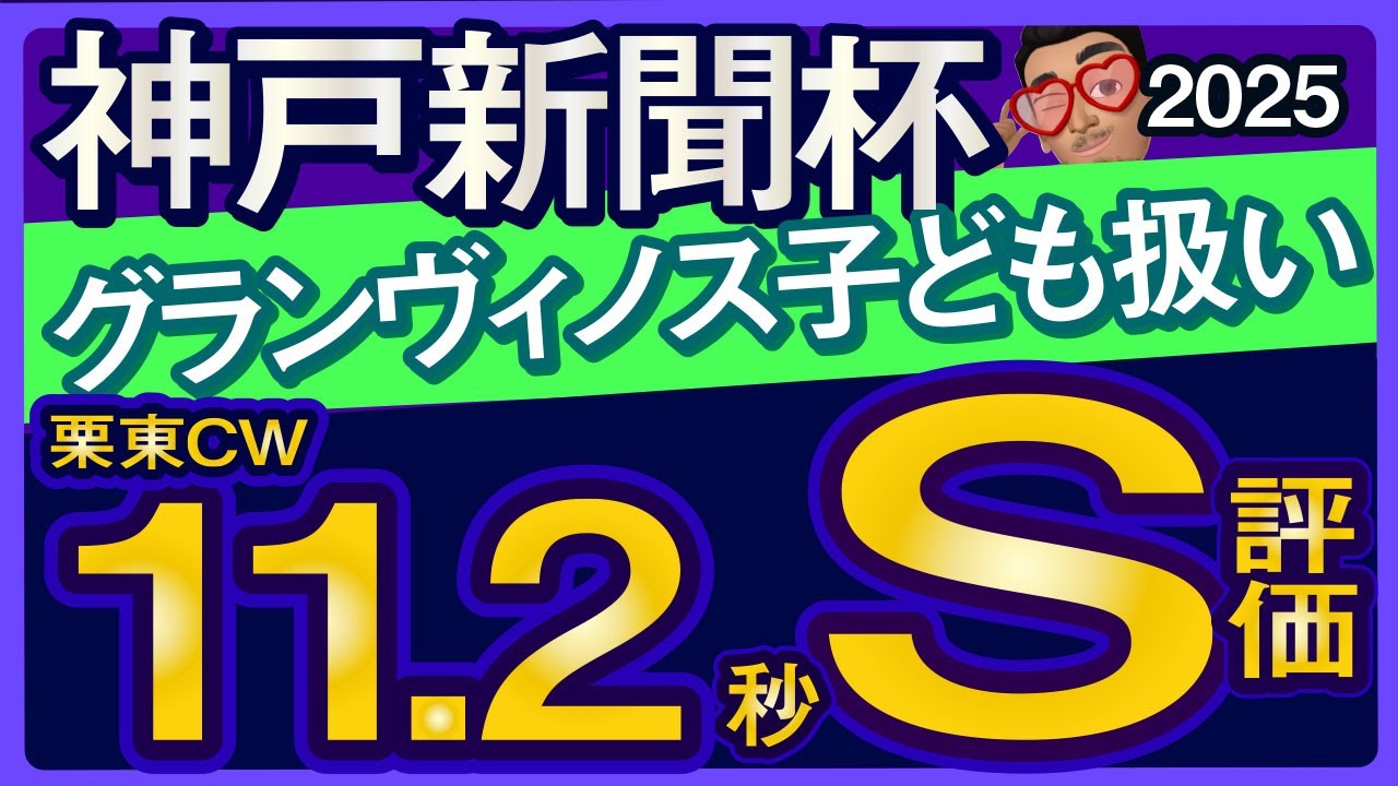 神戸新聞杯2025グランビノス子供扱い 立等コース11.2秒S評価皆様 こんばんは。加速情報競馬データ検証の野 でございます。本日は5分で分かる外級 データをいたしまして神戸新聞杯2025 をチェックしていきたいと思います。 [音楽] それではこちらが本日のメニューでござい ます。まず1つ目、神戸新聞杯出走力の 確認ということでございましてですね、ま 、ね、キ下賞に向けてのですね、ま、 権利取りのレースになるんですけれども、 ま、ダービーですね、あと、ま、その辺り ですね、ダービーの上馬がですね、 ちょっとね、天皇省秋とかですね、凱旋 猛章とかですね、違う路線に行きますので 、ま、結構ね、路線としてはですね、今年 はね、緩くなってるかなていうような現状 でございますけれども、ま、ね、ただ やっぱりね、ダービーバとかがですね、 そういうね、大部隊目指すってことになる とですね、その世代って結構やっぱり強い んですよね。なので、ま、世代レベルはね 、もしかしたら高いかもしれないなという ところでございますのでね、それぞれね、 可能性探りながら見ていきたいなという風 に思っております。そして2つ目でござい ます。過去の神戸新聞杯外級傾向学ぶと いうことでございましてですね、ま、今年 阪神にね、戻っております。その辺りね、 注目しながら見ていきたいなという風に 思っております。そして3つ目でござい ます。今年はどんな雨を狙うということで ございましてですね、過去の傾向から今年 狙ってくのポイント抑えておきたいなと いう風に思っております。なおですね、 今回の動画でりましたデータガイト前に 関しましては週末出そ場が確定いたしまし たレース前日に来てお送りさいております 。最終りとかですね、ま、こんな感じで ちょっと急車のネタとかですね、馬の変化 とかですね、ま、野外的に調べてですね、 これ人気以上に面白いんじゃないかな みたいな、ま、ですね、ピックアップさせ ていただいておりますのでね、是非楽しみ にお待ちいただければなという風に思って おります。下の概要欄からですね、1秒で 登録ます。是非登録してお待ちいただけれ ばなという風に思っております。 それでは順番に見ていきたいと思うんです けれども、まずはエリーキングでござい ます。デビューからですね、無傷の3連勝 で京都に再生クスを制覇。ただそこから ですね、骨折で離脱しましてですね、初戦 の殺さ11着大牌もダービーでは後方から 最速の上がりで追い込んで5着。やはりね 、能力はあるかなという風にもあります。 骨折なくてね、スムーズだったらと感じる ほどのね、阻止場でございましてですね、 今回は骨折のあった春から期間がね、経っ ておりましてですね、しっかり調整できた かなという風に感じております。1周前 川田騎種が起場して立のコースを詰めに7 ハ論で96.9秒、6ハ論で80.1秒、 姉妹が11.2秒。久々ですがね、かなり 動けてるかなという状況でございます。 能力あるよとことで、え、とさせて いただきました。そしてこちら翔平で ございます。木賞では4着まででした けれども、京都新聞杯をね、1着して ダービーの権利を獲得。そのダービーでは 期待通りの走りでですね、3着に激走して くれました。ま、今回ね、久々になるのと 賞金があるのでね、ま、どの程度仕上げて いるのかなっていうところがポイントに なってくるかなと思うんですけれども、1 周前ね、西塚騎種が起場しまして、立の コース82.6秒、姉妹はいっぱいに追わ れて11.6秒って形でございましてです ね。うん。ちょっとこの馬にしては時計も 出なかったし、なんか追われても伸びずっ ていう感じでね、ま、ちょっとまだ仕上げ 途上なのかなという感じをね、ちょっと 思わせるようなね、内容でございました。 ま、ダービーの時はね、期待したんです けれども、ま、ね、本番に向けて仕上げて くるだろうなという感じでございまして ですね、ま、ちょっとここはね、1回ね、 あの、叩いてっていうようなレース内容に なってくるのかなという感じがしており ます。仕上がりがどうかなというところで ございました。評価ね、ちょっとBに下げ させていただいております。そしてこちら 序盤2でございます。名の通りですね、 デビュー戦勝利して2歳重賞2002着と 序盤にね、活躍しておりました。はい。 ここちょっとクスっと笑っていいところ ですね。はい。関西になるとですね、ま、 赤ワステークスはですね、勝利するんです けれども、殺しではですね、4着ダービー では8着とですね、やや上位と差を感じる 競馬でございました。秋に向けてはですね 、大きく成長が欲しいところでございます 。1周前ですね、松山機種起場しまして リトのコースを79.3秒、姉妹かけて 11.4秒。自己ベスト更新で、ま、これ はね、成長あるかもしれないなという ところでございます。成長にね、期待 できるところあるんじゃないかなていう ところもありましてですね、
