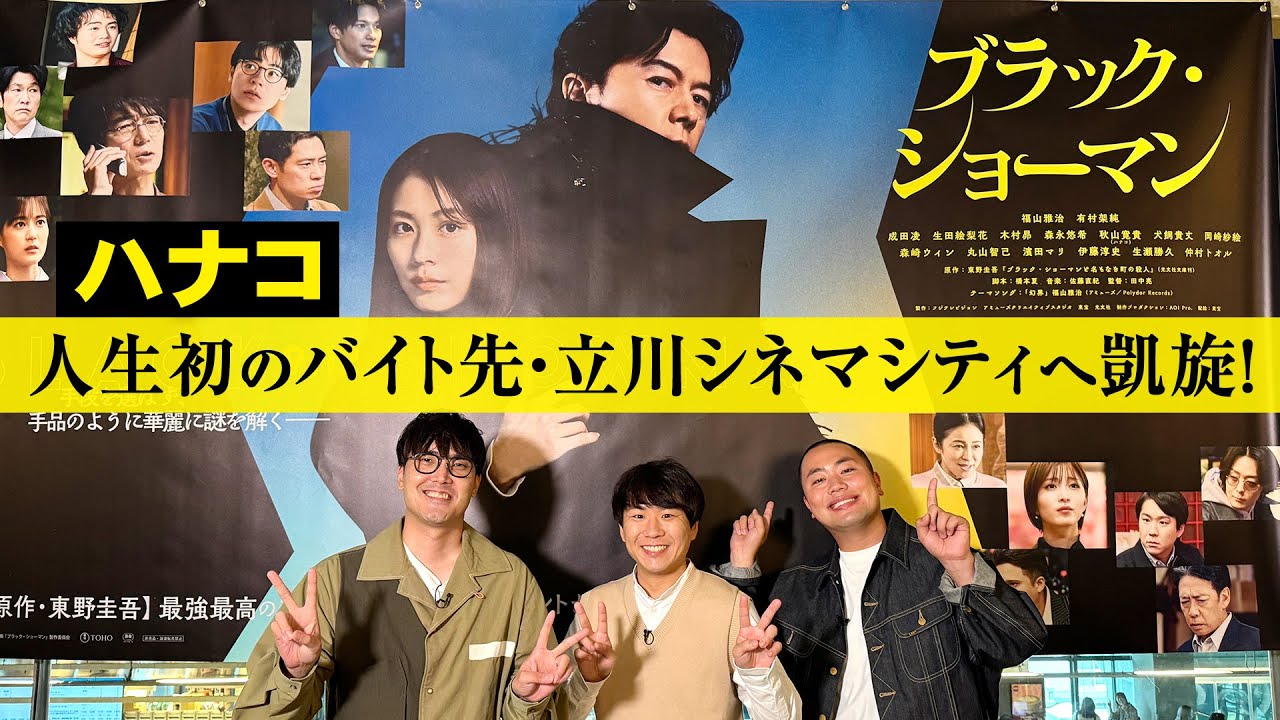 大ヒット上映中!映画『ブラック・ショーマン』で有村架純演じる真世の同級生役、牧原悟を演じるハナコ秋山。今回は秋山の元アルバイト先である立川の映画館へ、相方を連れてハナコ3人で凱旋した模様をお届けします!
