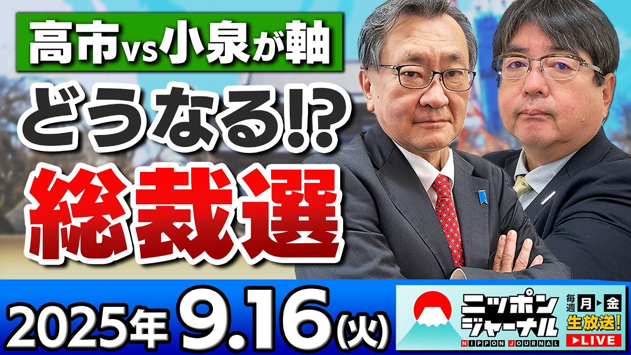 [音楽] お 元気ですか?おはようございます。え、9 月16日火曜日の日本ジャーナル間もなく 本番スタートでございますけれどもね、え 、本日はもう3系コンビという呼び名が すっかりね、え、当番組的には勝手に定着 させていただいてるつもりでございますが 、お二方でございまするさんと有本孝志 さん。え、百戦連馬のお二方をお迎えして ですね、もうみっちりたっぷり、え、正極 にまつわるニュース掘り、え、深いして まいりたいという所存でございます。え、 皆様もですね、随時あのご質問をね、お 寄せいただければと思いますので、本当に ご遠慮なくお寄せいただければと思います 。え、2時間ぶ当してね、中心のニュース 解説をお送りしますが、しかも番組後半の 、え、有料配信の時間からはですね、 スレスレタイムと 番組後半スレスタイムと名付けまして、 もうよりもうギリギリすれスレの解説をお 願いしたいなと。ま、ちなみにあの先々集 の関さんと杉田美になられた際にですね、 え、この企画やった大変好評だったという ことなんですけど、あんまりね、すれスレ とかギリギリとか連呼するとですね、あの 、戦後すぐのストリップみたいでですね、 あんまりあの、風気的によろしくないん じゃないかという響きの上でちょっと表現 変えた方がいいんじゃないかというご指摘 もあるかもしれませんけれどもですね。ま 、え、今回のところはひとまずご容赦 いただいてすれスレギリギリのところを ですね、アビルさん、有本さんに、え、 攻めに攻めていただければと、え、だいぶ 今回も無茶ぶり気味で大変恐縮ですが、え 、ご勘弁ご容赦のほどお願いしたいと思い ます。はい。え、ですからね、本当にあの 、視聴者の皆さん本当ご質問ご遠慮なくお ください。繰り返しになりますが、では、 あ、早速本日のニュースチェックま参り ましょうかね。ラインナップご紹介いたし ましょう。え、ニコニコやYouTube でご視聴の皆様は、あ、ご注目のニュースコメント欄に番号をね、はい、ご記入くださいませ。いきましょうか。はい、 ニュースチェック行きますよ。出ます。うん。今日はね、え、 13 本みっちり並んでおりますけれどもはい。えー、正極絡みのニュースい出ました。え、トップがポスト石党員表争奪。 [音楽] 小泉高一市有利の味方とうん。ま、ここら 辺はこのお名前2トップは動かないんです かね。え、そして、え、2番小泉陣営の 先体本部長に加藤勝が就任へとうん。今度 は3訳に回るということですか?え、それ から3番、各候補の劣県高一市公明党との 連携。ま、どうしてもね、公明党っていう のは条件として、え、外さ、外さないわけ にはいかないわけですよね。4番目、麻生 さんがすでに指示を示唆。うん。意外な 評価アップを得ている候補はどなたなのか というね。はい。え、まだこの段階では もちろん申し上げませんよ。え、5番目 連立化大児か野党内で背、え、総裁戦の 同行中止ということでね。はい。そして6 番目。国民民主党の玉木代表新創裁に年収 の壁とガソリン減税要求。うん。ま、ほら 当然でしょう。自分のね、え、自身の事論 に関して歩み寄りをしてくれるなら、ま、 対話に応じてもいいよということでしょう 。え、7番目。早期解散国民は厳しい目。 立憲民主のあさん。えっと、この度幹事長 ですよね。あ事長が自民党憲制。ま、ご 自身のところも事情もあるんでしょうが。 8番石総理の対人が妥当と答えた人が 64%。実績については評価するが44% というこれは、え、セ論調査、セ論調査で 読み入り新聞でしたかね。はい。え、9番 目、石理戦後80年見解を在人中に発表へ 。うん。やっぱり出すんですかね。うん。 なんかね、え、出す出すやっぱり出す みたいななんかドイツ語の監視の変化 みたいなドイツ語の不定監視みたいになっ ちゃうと思うんですけど。え、そして10 番目、アメリカ。車の完税16日に 引き下げ日本に15%影響緩和へとあり ますが、ま、でも現段階で楽観はね、でき ないんじゃないでしょうか、まだまだ。え 、そして11番目、アメリカ国防総省が長 者を処罰。うん。チャーリーク氏の、え、 政治活動でトランプ大統領とも極めて近い 関係にあったというね、え、大統領戦でも 弱年層の表に大変な影響力があったと言わ れている科学氏の射事件でSNS調査うん 、自業自得だとあらう論票をね、大嫌らに してしまう人々が目立っているということ ですけれどもね。え、そして12番目 エイサー祭り陸事出演中止要請につき、 沖縄市長が疑問市うん。このね、お祭りは 全体で県民全体で楽しむべきものなんじゃ ないのという至って当然のご指摘だと思い ますが、え、そして13番目、これね、 ホームタウン解消を検討騒度を収まらず例 のジャイカのね、え、日本とアフリカの 交流事業。これが積極的な移民受け入れ 政策なんではないかという、ま、え、誤解 だったということで秘消しに必死が3週間 以上経っても騒動が収まらずということ です