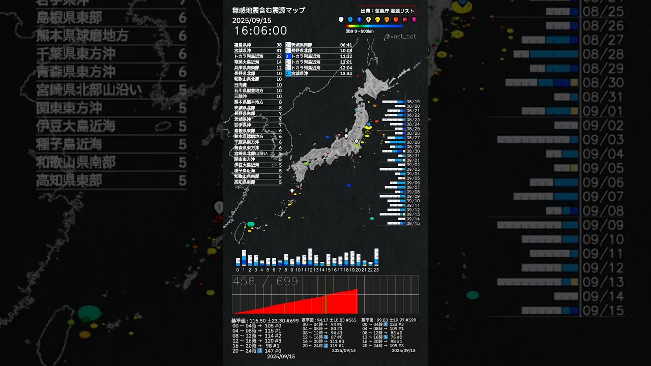 内容:2025年09月15日作成:2025年09月16日出典:気象庁ホームページ 震源リストより 🔗 https://www.data.jma.go.jp/eqev/data/daily_map/20250915.html 有感及び無感地震1日分の動画です本動画はYoutubeにも後ほどあがります。 🔗 https://youtube.com/@vnet_bot#地震 #jishin #earthquake EARTHQUAKEjishinNEWS地震震源情報