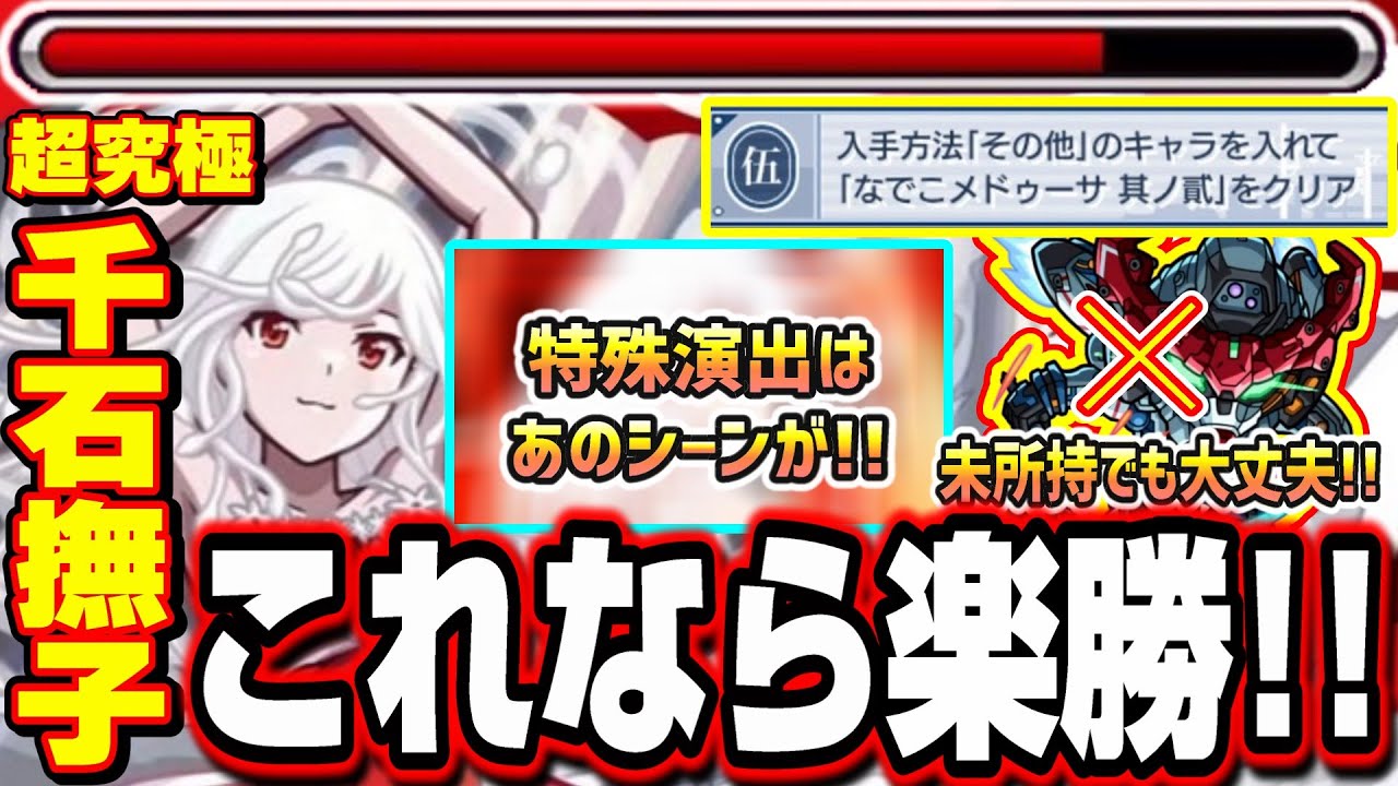 今日もゼルぶっちぎりマキピロ君でござい ます。はい、今回は超究極戦国なで子、 こちらの、ま、ミッション、その他の キャラクター1体編成するっていう、え、 攻略動画になります。はい。降臨期間なん ですけど、9月の15日の月曜日、19時 から9月の30日の火曜日、23時59分 までとなっております。期間はね、結構 長いので、ま、それまでに攻略すれば なんて問題はありません。今回の戦国 なでこなんだけど、え、攻略すると進化 解放になります。運極が欲しいっていう 場合、H一応ね、この攻略するとドロップ するんやけど、チョコでこの戦国なで子の 復刻、これをゴリゴリ攻略、えっと、周回 した方が、ま、運極簡単にできるので、ま 、そちらでね、運極作るのがベストです。 で、攻略して進化解放しましょう。はい。 で、なんでその他のキャラクター入れるの かっていうとこなんだけど、このなでこ スネイクっていうミッションやね。えっと 、123と進んできて、4つ目からなでコ メデューサー。ま、今回の長級曲をクリア する。そしてこの5つ目んとこなんやけど 、入手方法、その他のキャラクターを入れ てこれ1体で大丈夫です。今回の上級曲を クリアする。そうすると、えっと、この 右側のやつボイスとグッちブがもらえる ようになります。で、ボイスとグッちブ別 に興味ないっていう人は、ま、普通に攻略 だけでもいいかなと思います。ということ で、ま、攻略の方解説していきたいと思い ます。 はい。え、編成の方はガイン伊豆子、あと 現スマッシュ、マチュ。ま、これはあの 本当にキャラ持ってない人向けの、え、 自軍通常のキャラクターのみの攻略になり ます。で、まずしっかり覚えといて欲しい なというかね、ちょっと、ま、ここだけ 覚えといてもらえたら、ま、大概大丈夫 っていうところなんやけど、ファイリン、 ファイリンに関しては属性レーザーバリア の範内HP回復ちょっとぼんやり見えると 思うんやけどね。うん。で、天使この次の ステージから出てくるんやけど、こちらは 、え、クロスドがヒーリングウールの展開 でファイニーに関しては、ま、そこまで気 にする必要はないんやけど、天使、天使に 関してはこのヒーリングウォール展開が、 ま、4体とかまとめて倒すと4面張って くれると。で、1体だけポチって倒し ちゃうと、ま、ヒーリングウォールが1面 になるから回復手段がね、結構難しくなっ ちゃったりとかする。で、ヒーリング ウォール展開があるから紋章で、えっと、 ヒーリングの 紋章をつけてあげることによって結構 難易度がね、え、低くなるんじゃないかな と思います。ここやね。ここ電子、え、 まとめてね、4体バーンと倒せるっていん やけど、ま、ちょっとミスっちゃって、 今回1体しか倒せなかった。これが4面 展開されると、ま、特に アドバンテージは大きくなるかな。HPの 管理はすごいしやすくなる。ま、マチとか ね、編成しとればそこまで気にする必要は ないんやけど、例えばマチュがいないよう なね、え、編成とかになってくるとこの辺 しっかりやらないとちょっと難しくなるん じゃないかなと思います。で、あとは、ま 、パネルやね。パネルを注意してくださ いっていう感じかな。 本当もう嘘つき。みんなみんな本当に嘘 ばっかり。 はい。ボ線貼りました。えっとね、ボス戦 の初手なんだけど、え、反射の場合は、ま 、あんまこう暴れないことだね。で、貫通 でパネルを揃えてあげる。で、基本的に ここの削り方って、ま、反射がメインに なってくるんじゃないかな。貫通はどっち かというと調整に近いような、え、状態に なると思います。 で、えっと、この編成だったら正直削り しんどいんで、ま、SS早めに打ちました 。鬼ドーンって爆発したんやけど、ま、 爆発してもHP全部持ってかれるわけでは ない。今回の上級曲は。ただ鬼が爆発して 次なで子の、え、この真ん中のね、今22 になったあの攻撃あれ結構痛いから ちょっと気をつけてあげんとうんと大きな ダメージ食らうことになるかな。2発 食らうとさすがにさっき魔中で回復してた からまだ良かったけどっていう感じで。で 、ここは攻撃来ると、え、耐れないから、 え、サメを打ちました。大体ね、あの、 フォーミングがね、えっと、5万か6万 ぐらいなんでちょっとHP、え、その辺見 てもらって、あの、調整してもらうのが いいかな。で、ここも極力ここやね。特に ここ、あの、天使を一気に倒せればこれ1 体、これが1番危険。1体が1番危険。 これがね、えっと、最低でも2とかでやっ てれば、ま、L字で多分貼られると思う から、そうするとHPの管理がしやすく なるかな。なるべくここはちょっと強引2 でも早めに早めに抜けてく必要があるかな と思います。 ま、この編成でちょっと強引もクソも ちょっとないんやけどね。でなってくると これ1面やったらもう盾でヒーリング触っ ていくしかないんやけどヒーリングも回復 量が今回紋章つけてないのでめちゃくち
