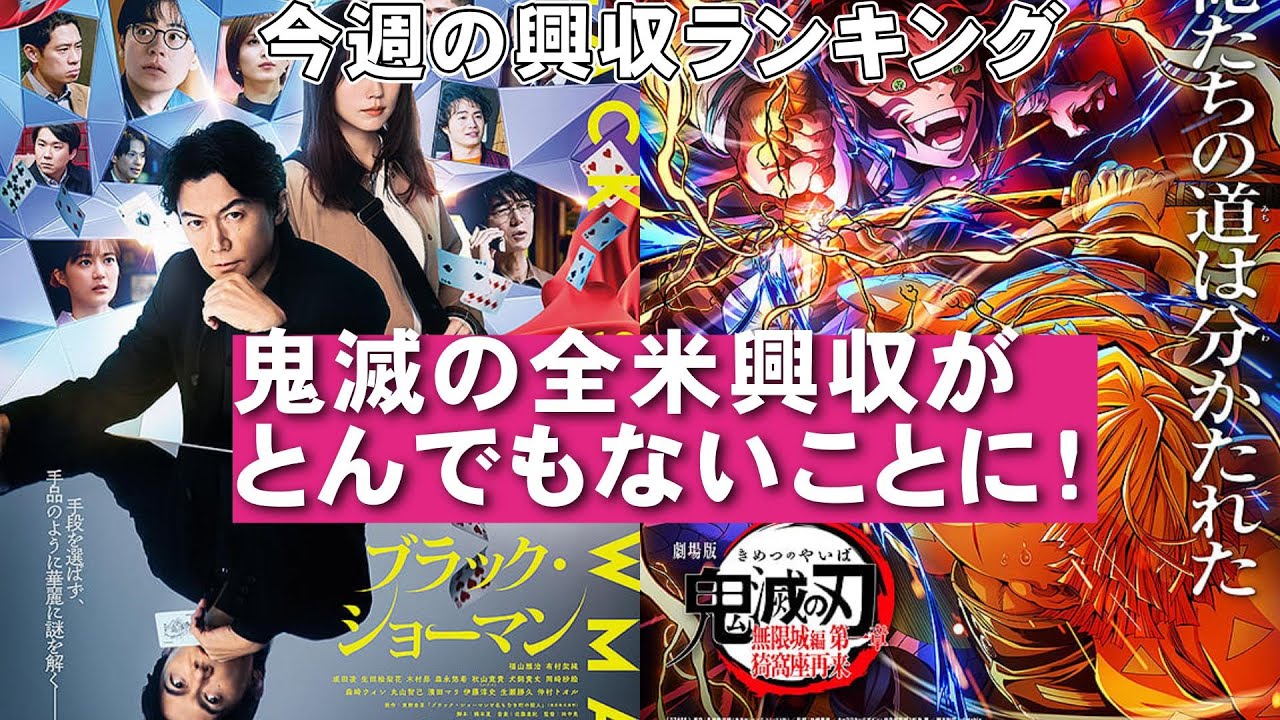 [音楽] [拍手] [音楽] どうも皆さんこんにちは。ミステリ坂の 七尾です。俺的映画速報第358回第1部 俺的映画速報では、え、今週の映画工業 収入ドイ数ランキングを見ながら映画の トレンドについて語っていきますという ことで、え、こちらは第1部ですね。 そしておそらく明日に第2部をあげます。 第2部は、え、今週金曜日から公開 スタートする新作映画を全て紹介して映画 にまつわざあるニュースをお届けする予定 となっております。ということで、え、 まずは第1部ですね。はい。というわけで ね、え、9月12日から14日までの国内 映画工業収入同員数ランキングが工業通信 者より発表されまして、え、今週はね、 こんな感じになってるんですね。まず新作 が、えっと 2つですね。新作が、え、あ、アインつば さんということで、はい、3本ですね。と いうことで、まあね、うん、言うまでも ないことなんですが、1位は鬼滅の刃と いうことでね、もう皆さんそろそろ 聞き飽きたんじゃないかなということで、 もう9連続1位となりました。で、この9 周目はね、週末3日間で同員 52万3000人、講8億3000万円 を上げているということで、もう全然ね、 あんまり落ちていかない感じがしますね。 はい、ということで、もう累計ですよね。 一体累計がどうなってしまったかってこと なんですけども、えっとですね、9月15 日までの累計成績は同員2304万人、 講衆330億円を突破しました。はい。 さあ、それでこれはどういうことかと言い ますと、そうなんですね、ついに、え、 千と千ひの神隠しをね、え、14億円も 上回ってしまったということで化けもんか よってことですね。 いや、もうこれで完全にね、え、無限列車 編に継ぐワンツフィニッシュということで 1位と2、歴代の1位と2が鬼滅の刃が、 え、閉めることになってしまいましたね。 はい。で、またね後でお話ししますけども 、海外公開が、え、始まってまして、 こちらもね、とんでもないことになって おります。はい。後で全米講習見てみ ましょうかね。というわけでね、ま、 とりあえず鬼滅の刃、え、2ということで ああ、もうね、え、無限列車編があと 71億円と7、え、違うね。77億円か。 あ、え、ちょっと俺計算できてないぞ。 78億円で1になりますね。78億円か。 こっからでもね、結構登り坂がきついん ですよね。うん。ま、しばらくね、大きな 休みはないですからね。次は冬休みか。 うーん。ま、映画の秋ただね、息勢いは あんま衰えていないので、この流れ、あと 、ま、入場した得典とかも充実しさせて いけばファンの人たちがね、え、見て くれると思いますから。78億円か。でも 結構やっぱ78億円って言うとね、まあ 実写映画で言ったら78億円つったらその 年のトップ中のトップになりますからね。 うん。もう50億円でもトップクラスです から。やっぱり78億円って言うとね、 まだ本当に年間トップ中トップみたいな、 えー、成績になりますから。それをね、 これから伸ばしていくってのは結構 ハードルはね、そんなに低くないと思うん ですよね。ま、現状で8億円ですから。え 、ま、これ週末3日間で8億円ってことは 、ま、1週間でどうだろう、12億円 ぐらいか。12、3億円ですもんね。で、 こっから12、ま、例えば10億円ペース でいくとまだ7週間ぐらいかかりますから 、7週間、8週間ですよね。7週間以上 かかりますからね。まだまだ長丁場ですよ ね。実際このペース先していくようであれ ばもうちょっとかかるってことになります から。うん。どうなんでしょうね。まあ、 でもなんか超えそうな雰囲気になってき ましたね。僕はね、正直無限列車編を 超えるのは無理じゃないかなと思ってたん ですけど、いや、なんかこれちょっと超え そうな感じになってきちゃいましたね。 うん。また僕の予想が外れてしまいそう です。ということではい。無限列車編ね。 あ、無限上編ですね。後でね、これ今回ね 、え、鬼滅はこの話題にはとまりません。 そうなんですね。全米公開が待ってます。 全米講習がね、え、ないになっているのか ね。そちらも楽しみ後でね、もうすぐにね 、お知らせします。というわけで、え、第 2位こちら来ましたね。ブラック ショーマンですよね。福山マサール小雪き みたいなね。え、2位はあ、新作の ブラックショーマンが初日から3日間で 同員39万6000 人。あ、公衆億 5600万円を上げ、初登場2ということ になりました。はい。ガレオシリーズの東 の敬語原作ア福山正春主演で最んだ ミステリーエンターテイメント。あ、これ あれすよ。僕が福山を真似しているんじゃ なくて福山が僕を真似しているんですから ね。というわけでね、今回福山演じ ラスベーカスで名をせたもっとマジシャン 神たけしの名でありが何かに殺され お父さんが何者かに殺されてたけしと バーディを組み殺人事件の解決に向けて 本送する神を有森ひ子さんが演じてる嘘 です。有村かさんですね。はい。有森え、 有森裕子。有森裕子。あれはね、