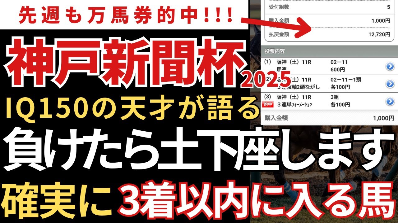 皆さん、こんにちは。IQ150競馬です 。この動画では神戸新聞杯2025の絶対 買いたい間について解説していきます。 先週はローズステークスやセントライト 記念はダメでしたが、チャレンジカップ 完璧適中でした。大オープンチャットでは こちらのような適中方向があったり、平場 でも当日の時空間予想をもに大きな適中 報告をいただきました。土曜日の当日予想 した阪神7レースは馬連で満券な適中し、 毎週万波馬券記録を更新しております。 LINEオープンチャットでは通常の予想 はもちろん時空マリストの無料配信も行っ ていますので、興味ある方は動画の概要欄 から是非ご参加ください。すでに1000 人の方に参加していただき、中央競馬だけ ではなく競馬も毎日配信しておりです。 参加してもらえれば間違いなく回収率が アップするはずです。さて、今週末は クラシック3巻の最終戦菊化ショート ライアルの重要な一戦G2神戸新聞杯が 開催されます。この動画では絶対買いたい 馬というテーマで膨大なデータを多格的に 分析し馬券の角となる一等を炙り出して いきます。早速ですが結論から言うと今回 私が絶対買いたい馬として注目しているの はアイリキングです。なぜこの馬なのか。 その最大の根拠はG1日本ダービーで証明 された経験値と阪神芝2400mという 部隊に完璧に合致する背足の指数。この2 点に集約されます。一見するとダービー5 着という結果は物足りなく見えるかもしれ ません。しかしその中身を紐解けば彼が 世代クラスの能力を秘めていることは 明らかです。これからその論理的な根拠を データで1つずつ証明していきますので 是非最後までお付き合いください。レース の基本情報とか傾向分析。まずレースの 舞台となる阪神芝2400mのコース特性 と神戸新聞配の歴史が示す勝利の法則を データで確認していきましょう。ここを 理解することが正しい馬選びの第1等です 。安心2400mは外回りコースを使用し ます。最大の特徴はゴール前に待ち受ける 工程差1.8mの旧坂と約474m という長い直線です。スタート直後にも 1度この坂を通過するためスタミナと パワーが総合的に問われるタフなコースと 言えます。そしてデータ分析上最も重要な ポイントがレースペースです。このコース は過去のレースを分析するとほぼ確実に スローペースになる傾向があります。3 同士の2400m線ということもあり、 互いに牽制し合うことで前半のペースが 落ち着き、最後の直線での瞬発力勝負、 いわゆる用意の展開になりやすいのです。 ここで1つの興味深いデータがあります。 客室別成績を見ると先行した馬の勝率連帯 率が最も高くなってます。しかしコース 形態からは早い上がりが使える差し 追い込み馬が有利にも思えます。これは 一見矛盾しているように感じますが、実は 論理的に説明がつきます。スローペースで バ群が固まりやすいため、後方から 追い込む馬はバ群をさくリスクや距離の ノスが生じます。一方で先行集団にいれば ノスのないポジションから一気にスパート をかけることができます。つまりこの コースで求められるのは単なる客室では なくスローペースの展開からでも上がり サー あるいは33両台のトップスピードを 繰り出せる能力です。先行できる馬が有利 なのではなく早い上がりを使える馬が先行 もできればさらに有利になると解釈するの が正しいでしょう。この高層場の共通点を 頭に入れた上で過去10年の神戸新分配の 統計データを見ていきます。1番人気の 成績勝率60.0% 連帯率70.0% 復勝率70.0% 1位3番人気の成績50年で急勝。前走 日本B組か50年で急勝。GARA3勝馬 か50年で発症3着内率52.6%。この データが示す事実は極めてシンプルです。 神戸新聞杯は日本ダービーに出走した上位 人気がその実力通りに勝つレースであると いうことです。特に1番人気の新度はG2 レースの中でも軍も抜いており、過去10 年で6勝連帯率70%という脅異的な数字 を記録しています。これは春のクラシック で厳しい戦いを経験してきた馬と夏に条件 性を勝ち上がってきた馬との間には明確な 能力差経験値の差が存在することを示して います。まとめると神戸新聞配を攻略する ための鍵は以下の3点です。スローテース からの瞬発力照明の適正。上位人気に指示 されるだけの客観的な実力。日本ダービー という最高峰の舞台での経験。これらの データから導き出される理想の優勝にどの 馬が最も近いのか。次のセクションで確信 に迫ります。撤退買いたい馬の先定と詳細 分析。全セクションで確立した勝利の法則 に基づき私が今回絶対買いたい馬として 推奨するエリキングの細かい分析に移り ます。彼がなぜこのレースで最高の パフォーマンスを発揮できると考えるのか 、その根拠を3つの側面から解説します。 第1の根拠は日本ダービー5着が証明する Gレベルの能力です。エリキングは前走 競馬の採点日本ダービーで5着に入りまし た。この結果だけを見ると勝ちきれなかっ た馬という印象を持つかもしれま