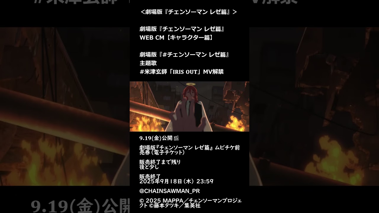 ![劇場版『チェンソーマン レゼ篇』WEB CM【キャラクター篇】+ [主題歌 米津玄師「𝐈𝐑𝐈𝐒 𝐎𝐔𝐓」MV解禁] + [ムビチケ前売券(電子チケット) 情報] 𝟗.𝟏𝟗(金)公開🎬 ©MAPPA 劇場版『チェンソーマン レゼ篇』WEB CM【キャラクター篇】+ [主題歌 米津玄師「𝐈𝐑𝐈𝐒 𝐎𝐔𝐓」MV解禁] + [ムビチケ前売券(電子チケット) 情報] 𝟗.𝟏𝟗(金)公開🎬 ©MAPPA](https://www.tkhunt.com/wp-content/uploads/2025/09/1758127570_maxresdefault.jpg)