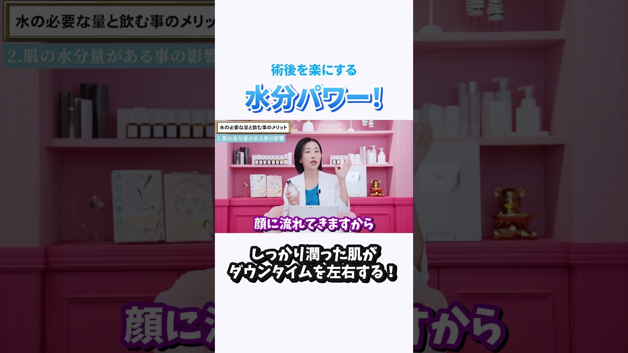 肌の水分量がたくさんある人の方が美容の 施術をやった時のダウンタイムが軽くなる らしいという研究結果があります。私も 教えてもらってへえって思ったんです けれどもこの根拠は何かと言うと水を たくさん飲むことによって肌のまず水分量 というのが改善します。そして肌の水分量 が改善すると何が起こるかと言うとまず1 つ目美少循環ま血液の流れですね。これが 改善します。で、血液の流れが改善する ことによってたくさんの新鮮な血液という のが顔に流れてきますから、血液によって 酸素が運ばれてくることになります。これ によって組織の酸素法和というものが 上がります。それから私もう1つの理由と して皆さんによくバリア機能、バリア機能 って言っていると思うんですけれども肌が 自分の肌を守るための能力であるバリア 機能というのは肌の水分量が適正である ことによって高まります。このため肌の 水分がたくさんある肌というのは簡単に 言えば強い肌になるんですね。だから水を 十分に飲んでいて肌の水分量が高まって いると酸素法和が高くなるので傷は治り やすくなります。そしてバリア機能が高く なるので良くない反応というのが起きにく なり