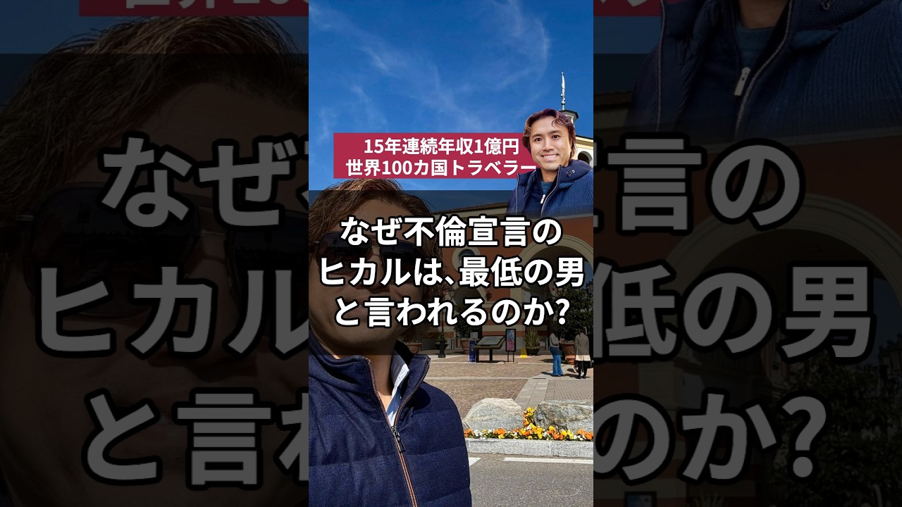 なぜ不倫宣言のヒカルは最低の男と言わ れるのか?6月7日に入籍したばかりの YouTuberヒカルがオープン マリッジ不倫する宣言を自身のチャンネル でして最低の男だと話題になっています。 チャンネル登録者数は17万人も減りまし てコメント欄ではひどい男だ人として最低 なんて声が相ついでいます。また怒って いるというよりがっかりしたという声が 多いです。なぜこんなに多くの人を失望さ せてしまったのかと言うとわずか3ヶ月間 で相手を幸せの絶調から不幸に突き落とし たというイメージが強いからでしょ。 ヒカルの奥さん、進撃のノアの本心は誰に も分かりませんが、外から見ますとその ように見えるわけです。またそれを YouTubeで発表したことで奥さんの プライドを傷つける行為を晒らしている ように見えるわけです。新婚で幸せなはず の奥さんを不幸に突き落とし、しかもそれ を見物にしているため男として最低と言わ れるのです。そんなわけでヒカルは当初 より浮気すると言ってますし、みんなそう 思っていましたが、それを3ヶ月後に わざわざ宣言したのが最悪だった感じです ね。不倫は文化かどうかは意見が分れる ところでありますが、幸せの絶調の時期に 相手を突き落とすのは誰もが良くないと 思うことでしょう。ダウンタウンのはハマ ちゃんのように結婚20年後、30年後の 不倫発覚で、しかも謝罪していたら奥さん も世間も人気者だし仕方ないよねとなって くるものですが、さすがに時期が早すぎた と思います。あなたも私も不倫に限らず人 をっかりさせたり恥を欠かせたりしない ように気をつけましょう。具体的なお金の 稼ぎ方は私が15年以上前からメルマガで 配信しています。その結果実際に多くの 読者さんがお金持ちになりました。そして 私のコミュニティ川島塾は日本一致な コミュニティになっていると思います。 是非川島と川島ずっと検索してあなたも 豊かになって