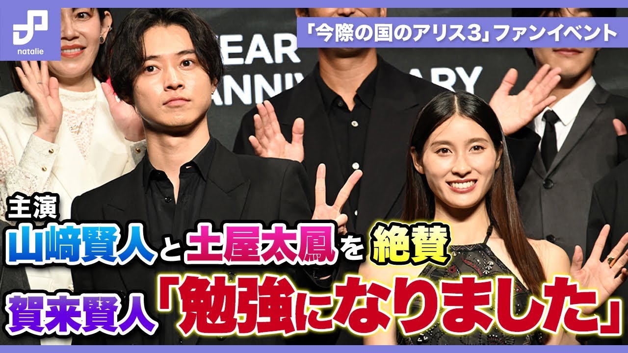 Netflixシリーズ「今際の国のアリス」シーズン3のグローバルファンイベントが9月11日に東京・ベルサール渋谷ファーストで行われ、キャストの山﨑賢人、土屋太鳳、磯村勇斗、三吉彩花、毎熊克哉、須藤理彩、池内博之、玉城ティナ、醍醐虎汰朗、玄理、吉柳咲良、賀来賢人、監督の佐藤信介が登壇。キャストが昼夜逆転した撮影を回想した。