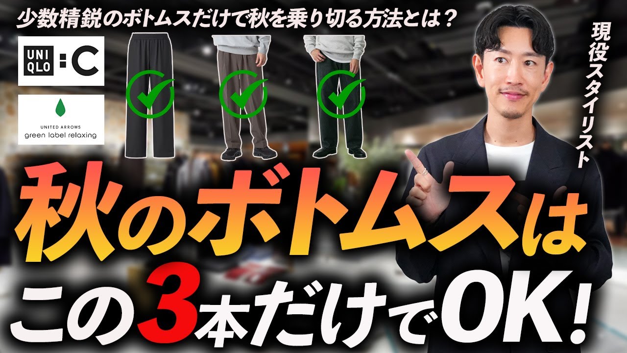 こんにちは。スタリストの小山しです。 今回の動画なんですが、大人の秋の ボトムスはこの3本だけあればいいという テーマでお届けをしてみたいなと思ってい ます。ま、僕のチャンネルの中ではこの ような数量を限定したシリーズをよくやっ てまして、例えば秋のアウターはこの3枚 とか、秋のトップスはこの5枚だとか、ま 、そういった流れの中で今回はボトムソ3 本という形で限定しながら皆さんにお勧め をしていきたいなと思っています。服と いうのは本当にバリエーションがたくさん あるんですね。ま、今回ボトムス3本と 厳選していますが、ま、本当にいろんな形 のボトムス、あとは色の展開もあります。 例えばですね、デニムもありますよね。 デニムにしてもブルー系もあればブラック もありますし、チノパンみたいなものも ベージュもあればブラックもネイビーも あります。またカーゴパンツとかベイカー パンツだとか様々な形のボトムスがある中 で、ま、なんだかんだでですね、よく使う ものってそんなにたくさん僕はないと思っ てるんですね。個人的にはボトムをですね 、いろんなもの持っといて運用するという よりは、ま、3本ぐらいお気に入りのもの があって、ま、それらをうまく活用し ながら、あとはトップスだとかアウター、 足元の靴ですね、こういったものを買える だけで結構コーディネートの バリエーションは作れちゃうんですよね。 なのでボトムスもそんなに量は必要ないか なと思っています。今回は秋に使えそうな ボトムスですね。今実際にオンラインやお 店で売っているものの中から厳選して皆 さんにご紹介できればなと思っていますの でよかったら最後までお楽しみいただけれ ばなと思っています。こちらのチャンネル では大人男性に向けてメンツファッション の今ですね、なるべく分かりやすく解説を しています。また僕自身のブランドという ものも展開してまして大人の男性に向けて ベーシックかけるほんのちょっとの トレンド感。この辺りをミックスした服を ですね、作っていますので、よかったら こちらも概要欄の方からチェックしてみて ください。それでは早速本編に行ってみ ましょう。 [音楽] はい。ということでここからはですね、 大人の男性にお勧めしたい秋のボトムスを 3つご紹介していきたいなと思ってるん ですが、まず1本目はですね、こちらです ね。ユニクロCのEージワイドテーパード パンツですね。価格がなんと驚きのですね 、3990円ということで、まあこれは ですね、僕自身も買ったものなので、ま、 よりリアルに皆さんにお勧めしやすいもの かなと思っています。ま、こちらの ボトムスに限らずワイドパンツみたいな ものは最近トレンドアイテムとして いろんなショップで取り扱いがあるんです ね。もうこれといって珍しい商品でもなく て、ま、ありふれたジャンルにはなってき てるかなと思います。ただワイドパンツの 中にも僕たち大人世代に似合うものもあれ ばちょっとむずいなってものもあるんです ね。あまりにドカーンと太いものは やっぱりただただスタイルが悪く見えるの でちょっとはまりが良くないんですが 程よいワイド感で足がすっきりと見えたら 最高だなと思うんですね。その点こちらの ユニicロCのですね新作のEGワイド テーパードパンツはかなり良かったんです ね。自然レビューの段階から結構注目はし ていたんですが、ま、そんなに派手さが ないアイテムなので、どうかなと思って 試着をしたら、あれなんかいいぞという形 でじわりじわりと良さを実感していったん ですね。まずシルエットの特徴なんですが ワイドということで桃回りには結構ゆりが あります。ニクロのワイド系のパンツの中 では割と太さはあるんですが、クソに 向かって低パードと呼ばれるような徐々に 細くなるようなラインになっていまして、 そのおかげでダボっとしすぎないと言い ますか、割と足の見え方は綺麗なんですね 。ま、モデルさんが着てる状態も見て いただくと分かるかなと思うんですが、 太いんだけどもストンと落ちるという ところですごくバランスがいいんですね。 あとは素材ですね。ちょっとこう表面は ですね、ウールっぽく見えるんですが、 ポリエステルとレオですね。ま、この辺り がメインで作られていまして、質感が すごくいいのと、レオ4という素材が 混ざることで表面に美光卓が漂うんですね 。このおかげでより綺麗に見えるんですね 。シルエットは太いんだけども、素材感が ウールライクでレオのおかげで美光沢が あると、なおかつストンとこう生地が 落ちるような形でドレープ感も美しいので 破ったく見えないんですよね。これが ユニicロCが考えるワイドパンツという ことですごいバランスがいいんですね。 しかも値段が4000円未満ということで どこを切り取ってもなかなか敵がいないん じゃないのかというぐらいですね。完成度 が高いです。で、色の展開3色で全部 いいってい