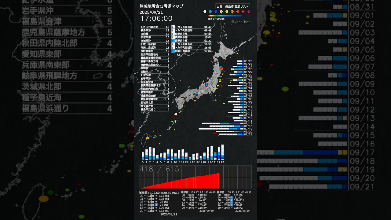 内容:2025年09月21日作成:2025年09月22日 出典:気象庁ホームページ 震源リストより 🔗 https://www.data.jma.go.jp/eqev/data/daily_map/20250921.html有感及び無感地震1日分の動画です 本動画はYoutubeにも後ほどあがります。 🔗 https://youtube.com/@vnet_bot#地震 #jishin #earthquake EARTHQUAKEjishinNEWS地震震源情報