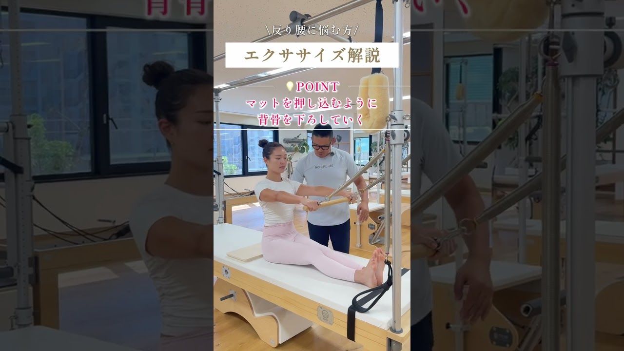 はい、 そり越し。女性で多い姿勢ですね。ソり越でフォーカス部分はこっちか。 3つ。で、1 つ目はですね、骨盤、この位置ね、骨盤の位置が前傾している前傾っていうのはですね、こう剃ってしまってる状態を骨盤の前傾と言います。腰がいるっていうのはテス的にはですね、骨盤の傾いてるっていう表現をします。で、 2つ目はですね、腹圧の不足。 ってピラティスでは息を吐く時にですね、 腹筋軍なんですけども腹筋がですね、こう 収縮する、縮まるという、ま、状態を作る というものを強化するんですけどもね、 この腹筋というものが、ま、弱くなって いる可能性がありますね。で、同時にね、 背骨を支えているタ列金、こういったもの もですね、弱くなっている可能性がある。 で、3つ目がですね、姿勢。ここで フォーカスしたいのはね、かが上がってる ハイヒール。と上げて立つと骨盤って前傾 します。なので今日はこの3つをですね、 1つのエクササイズで改善する方法をお 伝えします。このエクササイズ キャデラックという機械を使ったロール アップというエクササイズなんですが、 実際にはこのバーを持ってもらって後ろに ですね、マットを引いてます。で、この マットがポイントでして、骨盤を動かす時 にですね、さん、この骨盤を光形させる時 にこのマット押し込むようにしながら背骨 をマットに下ろしていきましょう。はい。 そうです。 で、ピラティスではこの骨盤を安定させ たり、背骨を動かしたりするようなワーク がたくさんあるので、骨盤を安定させ、 背骨を安定させ、さらにその可動域を 高めるというエクササイズを紹介します。 で、頭と胸。はい。そうです。で、この まままたですね、この後ろのマットを 押し込みながら 背骨を剥がしていきます。はい。で、ここ で背骨を持ち上げましょう。この骨盤を 自分で動かす力だったり、この背骨を 動かすことでこのタレ付きをね、伸ばし たり縮めたりしています。で、足なんです が、今足赤さんは綺麗にまっすぐ揃えて ますが、もっと閉じた状態を作り、つ先は ポイントさせた状態で最後もう1回いき ます。吐きながら骨盤を好形させ、 そうで、その時にね、目線は前を見てい ます。そうです。はい。頭と胸を上げ、 ロールアップで上がります。 はい。では胸を張りましょう。一見簡単 そうに見えるこのエクササイズですが、 行うべきポイントは骨盤の安定や背骨に 動かしたりする方法であとはですね、呼吸 を合わせて動く方法。呼吸を倒わすことで 腹筋を正しく同員したり滑らかに動くこと で骨盤や背骨を自分の力で動かすという力 も高めていくと。こういうエクササイズで 実はそり越しが改善していき