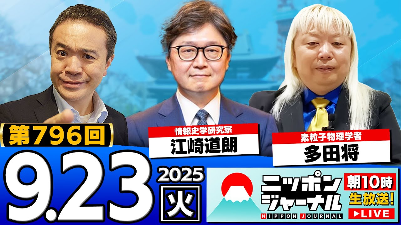 [音楽] お [音楽] おはようございます。え、9月23日祝日 の火曜日。間もなく日本ジャーナル本番 スタートでございますけれどもね。え、 本日ご出演は情報士学研究家の江崎道さん とそして祝日に駆けつけてくださる日本で 1番ノーベル賞に近い男、え、素粒物理学 者のた先生お二方ご出演でございます。え 、もちろんね、有料時間帯にはまた特別 企画ご用意しておりますので、お見逃し なく最後までお付き合い願えればと思い ますが、え、早速本日のニュース アンケートちょっとね、え、撮っていき ましょう。ラインナップご紹介しますね。 はい。え、YouTubeでご視聴の皆様 、ニコ生でご視聴の皆様、え、着目された 話題はい、番号で、え、是非ご記入 いただければと思います。まあ、からもう ね、自民党総裁戦に絡むニュースドっと これもう否めないというところで1番はい 。告自後ごえ正式に国自5人が立候本格的 な論戦始まる に高一市太陽光校など補助金制度について 大掃除をやる覚悟。え、3番目、え、 同じく高一さんが国土と国民を守る組織 作らせてと訴え。え、そして、え、4番目 、小泉慎さん。出人式に代理を含めて92 人が出席と、え、候補5人の中では採たと いうことですね。うん。え、そして5番目 打って今度は日体関係に関わるニュースで 台湾で安倍晋三研究センター設立大会、え 、来相当も出席の上でということですから ね。肝入りでということでこういう動きは ね、もう常になんか台湾が先じるというの がなんか皮肉の話。皮肉と言っちゃなん ですけどね。うん。え、そして、え、6番 目、え、原子力潜水艦は圧倒的 アドバンテージだと中国人対抗策として、 え、近く遠くない将来リアル沈黙の艦隊が 実現するのかどうかという。はい。え、 そして7番ロシアの戦闘機3期が、え、 バルト三国のエストニア領空を審判したと いうニュースなんですが、え、これについ てはほとんど地上派のメディアはね、触れ てないんじゃないのといった。はい。その 意味で別の意味でのね、警報が発せられて おりますので、え、ただ三江崎さんにこの 辺りお伺いできればと思います。え、 そして8番パレスチナの国家承人巡り日本 政府に対し訴えというね、え、英語で コメントされてましたけれどもはい。それ から米軍9番目のこのニュースもね、 ヒリヒリですね、大量負傷者を想定して、 え、野線病院展開する訓練を公開というね 、え、ニュース。そして10番目、え、 この話題はね、昨日も出ましたが、あ、 維新福の大阪都構層、え、国民民主がこれ に対案ということで、え、自民公明への 接近を日本維新の会本当に正式に図るん でしょうかね。連立入りも考えているのか 、本格的に。 え、といったところですが、視聴者の皆さんの注目ポイント、どのニュースにはい、集まってるでしょうか?そろそろ数字出ますかね?うん。 [音楽] はい。2 番。 おお、2番。うん。 2番優勢ってとこですかね。 ニコニコは6で続いて2です。 はい。ニコニコ6続いて2ですか?じゃあ 2番かな? うん。はい。え、じゃあ話題今日トップ 2番からじゃ参りましょうかね。 え、これからいよいよヒートアップの同を 増してくる自民党総裁戦に絡めてという ことで、え、番組抗がなんですが有料 タイムこのような特集ご用意いたしました 。はい。え、自民党総裁戦護者が続々と 記者会権見その政策の裏側ということでね 、え、もう確保それぞれね、もちろん特色 をどう打ち出すか、え、様々駆使にされ てると思いますが、え、実際にね、え、 広報者本人よりも汗を流されてるのは、え 、ブレンの方々かもしれないというか、 その可能性が、ま、大ですけれども、え、 その人々、チームというものがどういう風 に形成されて、え、候補者それぞれの、ま 、マニフェストだったりね、え、こう 決め手になる政策だったり、どのように 具体的に決まっていくのか、え、経験な 実際にいろんな政治家の方々の3暴薬をお 勧めになられてきた崎長さんにその裏側 打ち幕をですね、え、はい、ご解説ればと 有料時間帯で企は是非お見逃しなくどうぞ ということで、え、ここで、え、繰り返し になりますが日本ジャーナルから、え、 YouTubeメンバーシップの料金に 関するお知らせをお許しください。一般 有料会員様は従来通り1190円でご利用 いただけますが、え、家て加えて応援 プランといたしまして応援用ごひ様コース 2990円、え、応援用金に輝く谷町様 コース1万2000円とそれぞれ設定させ ていただいております。え、谷町様、ごひ 様、さらにニコニコ有料会員6ヶ月以上を ご継続いただいている視聴者の皆様には 特典動画もね、え、ばっちりご用意して おりますので、はい、抜かりなくご視聴 いただければと存じます。え、題して聞け ば誇らしくなる日本偉人伝、これはもう 是非ね、もう、え、お1人残らずご覧 いただければと。はい。え、今週から さらに1本増えて都合10本にツもり、 ツもってまいりましたね。え、江崎一代 さん、