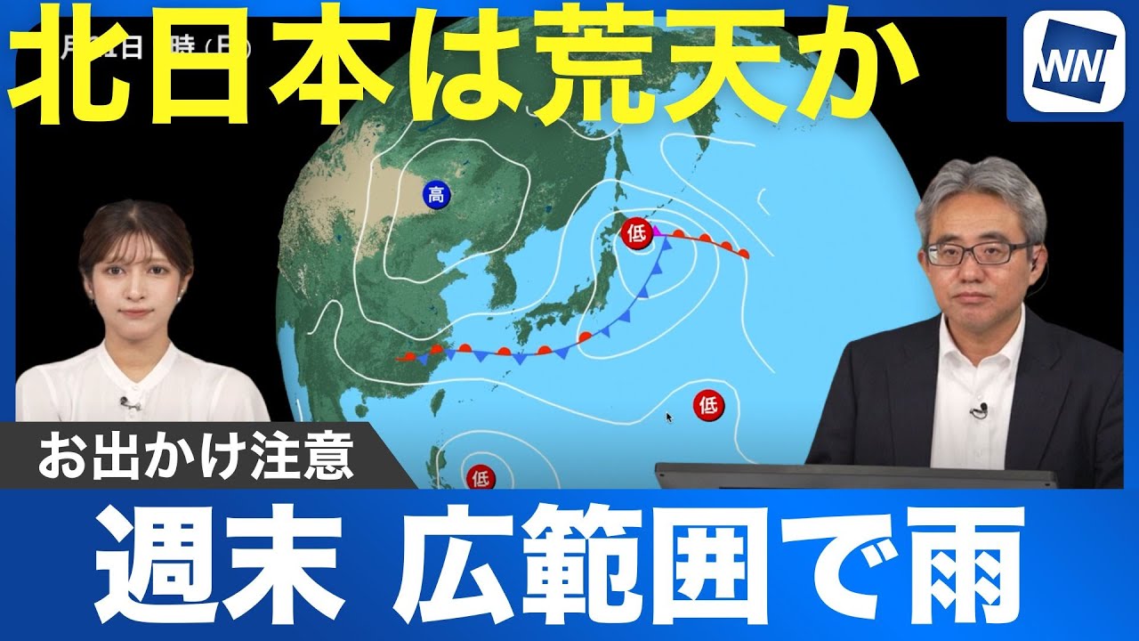 この先週末は西日本、東日本を中心に雨の降りやすい天気となります。え、特に雨の強まりやすい地域っていうのはありますか? そうですね。目先土曜日にかけて西日本、東日本なんですけども、え、その土曜日の後半から日曜日にかけては特に北日本、え、こちらで天気が荒れることになりそうですのでお気をつけたければと思います。 はい。はい。え、では今後の様子を詳しく見ていくといかがでしょうか? はい。え、気圧配置の方見ていただきます と、明日の段階で東中にやってくる前線、 え、この前線上でですね、低気圧が発生し て発達するということになりそう。土曜日 の段階で発生した低気圧、え、これが 日曜日にかけて、え、急激に 北東の方向に進む、え、到圧線の数も混ん できて、え、気圧が急低下すると、え、 いったようなことになりそうです。え、 この土曜日から日曜日にかけての流れ、 もう少し詳しくですね、え、解析点の方、 え、切り替えて見てみたいと思います。え 、こちらの方面なんですけども、え、時間 の後戻ってこう見ていただきますと、 土曜日の、え、午前9時の段階、え、この 段階では、え、すでに東日本、西日本、雨 のところが多く、え、北日本では雨雲が 木前に迫ってると、え、いったような感じ なんですけども、え、これがお昼以降東北 地方で雨が降り出して、え、夜にかけて こう発達した、え、低気圧が北日本にしっ しっかりかかってくると、え、いうことになりそうなんです。え、この低気圧なんですけども、 はい。 上空のですね、え、仮装の、え、風の様子 、え、こちらの方でこう見ていただきます と、え、かなり、え、仮装の方で、え、 50ノット、ま、25m以上の非常に強い 風と、え、いうのが予想されておりまして 、え、強い雨、また地上付近でも、え、風 の方がかなり強まいやすく、ま、防風と なる恐れもあるということになりますので 、え、土曜日、後半から日曜日にかけて、 え、特に、え、北日本の方を気をつ いただければと思います。 お気アイコンの方で見ていただきますと、土曜日低圧と前線の接近で、え、基本的に後範囲で雨ということになりまして、土曜日の後半北日本天気荒れてくる状況。え、ただ一方で日曜日になりますと大阪から西のエリア、え、また東日本代表側のエリアについてはある程度差しの方が戻ってくると、え、こになりそうです。 え、そして、え、その後ですね、え、富で火曜日の週の日にかけては、ま、比較的晴れたり曇ったり、え、天気の、え、崩れというのは大きな崩れには至らなそうですので、え、この土曜日、日曜日というところだけお気をつけたければと思います。 はい。え、この先週末ということでお出かけ予定されている方もいらっしゃるかもしれません。 え、是非こまめにですね、最新の雨情報 だったり交通期間の情報なども詳しくご 確認ください。最新の気象情報はアプリ ウェザーニュースからご覧いただけます。 [音楽]