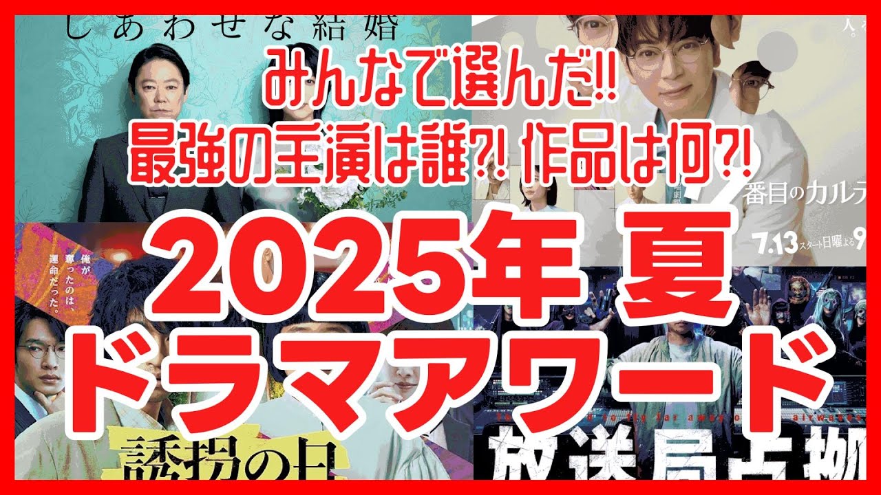 2025年夏ドラマで人気だった作品は フジテレビ愛の学校テレビ朝日誘拐の日 テレビ朝日幸せな結婚で僕たちはまだその 星の高速を知らないということで富士系列 とテレビ朝日が上位を独占しました。主演 俳優賞、女演俳優賞も発表していきます。 最近の日本の映画に関するアンケートです 。僕が最近見た動画4つの中で1番 面白かった、見られてないけど1番見たい と思った映画を選んでください。選択肢は 4つです。1宝島サ瀬鈴2八番出口 井宮和成高知大和3東京M走る999名室 鈴木両平江口洋介4国報吉沢涼横浜竜星 YouTube動画のコメント欄に アンケートを設置しているので是非回答を お願いします。そして他の人が何と答えた か是非確認してみてください。 ドラマ考察チャンネルで開催した2025 年夏ドラマアワードの結果を発表します。 この動画のコメント欄に感想を書き込んで みんなで気持ちを共有しましょう。 2025年夏ドラマに関するライブ配信は この後も予定しています。トケル2トケル 2というサブチャンネルで開催する場合も ありますのでご注意ください。この チャンネルでは地上派で放送されている ドラマに関する考察動画を今後も公開して いきますので、引き続きチェックしたいと いう方はチャンネル登録をお願いします。 2025年夏ドラマアワードみんなで選ん だ最強の主演最高の作品は何の動画です。 主演優、主演女優賞、女優賞、女優賞、 主題化、最優秀作品が選ばれましたので 発表させていただきます。2025年の夏 、7月から9月頃に放送されたドラマや その出演者についてみんながどう評価した のかということを知りたくて、勝手に表彰 する2025夏ドラマアワードを開催させ ていただくことにしました。僕の YouTubeチャンネルでアンケート 取らせていただいた結果を公開しながら、 今期のドラマを振り返っていきたいと思い ます。約150人の方に投票していただき ました。少々手がかかる投票にご協力 いただいてありがとうございました。なお 、他のアンケートでも同じことではあり ますが、僕のチャンネルに集まって くださっている方の回答ですので、もしか したら偏りがあるかもしれませんが、そこ はご了承ください。アンケート結果はこう だったけど、私はこう思ったという コメントも大歓迎ですのでよろしくお願い します。 今回対象になっているドラマ作品はこちら です。21時から22時59分までに放送 開始するドラマを主に対象にしています。 NHK作品など一部抜けている作品もある かもしれません。この後の発表に際しては ドラマのネタバレもあると思いますので その点はご容赦ください。アンケートの 取り方ですが、今回は全ての項目で1人2 票ずつ投票可能としました。1人1票だと かなり偏りができてしまうかもと思った ためです。最優秀を2つ選んでくださいと かちょっと変かもしれないんですが、取得 方法は今後も色々試していきたいと思って います。それでは早速発表していきますね 。 優秀主演弾優勝はこちらの4人です。主演 が何を指すかを先にお話しておくと、これ は放送しているテレビ局が主演と発表して いる人を主演省の対象にしています。人に よっては女遠ではなく主演ではと思われる 人もいるかもしれませんが、あくまで テレビ局の発表に基づいているとご理解 いただければと思います。上位4人を優秀 まるま賞とさせていただきますね。時点は 放送局選挙の桜井さんでした。そして 最優秀主演男優は 誘拐の日の斎藤さんでした。 幸せな結婚の安倍佐尾さんと最後まで競っ ていたんですが、おそらく当初から斎藤巧 が1位で逃げ切った感じです。1位斎藤巧 。誘拐の日ではコミカルで情けない斎藤匠 さんを見ることができました。斎藤匠さん のかっこよさを隠すためなんかずっと顔に 怪我をしているような印象がありましたよ ね。物語ラストの不審な表情も気になり ました。2位は安倍佐尾さんで65票。 すごくモてる役でしたよね。情けなかっ たり的に動いて失敗したりみたいなことは 全然ない。かっこいい安倍佐尾さんでした 。3位は磯村斗さんで52票。ドラマその ものはあまり話題には登らなかった印象 ですが、でもこのドラマが最も好きと答え られる方も多い作品でした。伊村さんは この作品では気の弱い弁護士という他の 作品とは違う印象の役を丁寧に演じられて いたと感じます。4位は松本じさんで39 票。19番目のカルテは原作のあるドラマ だったんで内容はしっかりしていて見応え ある作品だったと思います。和数が 少なかったのは元々の計画通りなんですか ね。後半で出演者のスキャンダルがあった のが残念でした。松本巡さんの意思の役は 新鮮でしたし、かなり落ち着いた人という 印象の役もはまり役でした。 [音楽] 今期は男性主役の方が多く、女性主役は 少ない印象でした。優秀主演女優賞は こちらの4人です。時点は初恋ドックスの 清原かヤさんでした。清原さんは4位の方 と一票差でした。そして最優秀主演女優勝 は 愛の学校の木