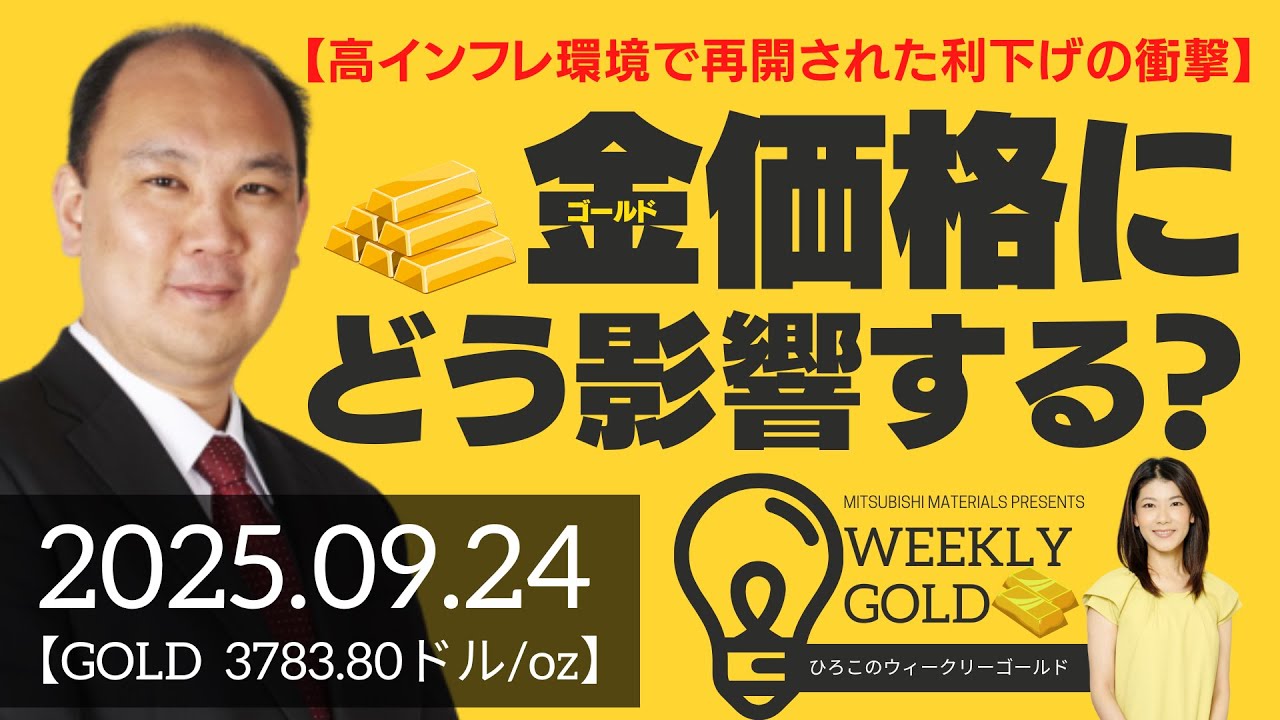 皆さん、こんにちは。ひろのウィークリーゴールデへようこそ。今回はマーケットエッジ代表小すげツムさんと一緒にお届けします。小すげさん。 はい、こんにちは。 よろしくお願いいたします。 はい、お願いします。 2025年9月24日、この9 月もですね、ゴールドは連日の市場祭高値を更新。ゴールドだけではなくて、なんか他の貴金属非常に強い動き見せてますね、小すげさん。 そうですよ。なんか貴金属全体が大きく日変わってますよね。 はい。この危金全体がね、位置変わってるってことの背景に何があるのかということを含めて、今日は、ま、アメリカもね、理下げ始めましたからね。 そうですね。よいよ始まりましたね。 いよいよ始まったということでさあこからの金価格どう読むか今日は小すげさんにじっくりとお話伺っていきたいと思います。さあ、その前にお知らせがあります。さ、今週ですよ。もう今週の土曜日に迫りました。 9月27日ゴールドフェスティバル 2025が開催されます。もう本当に連日 の市場最高高値更新ということで、え、 大変注目が集まる中での開催となります。 さあ、ここからこのままずっと上がり 続けるんでしょうか。ということで、え、 ここから先の均等どのように向き合って いけばいいのか、え、ずらりと並んだ豪華 講師人が、え、1日かけてゴールドを多格 的に解説させていただきます。え、会場は もう満員音礼となりました。お申し込み いただいた方、どうぞ会場で、え、お待ち しておりますのでお越しいただければと 思います。え、会場に来られない方のため にオンデマンド配信というものをやります 。え、動画で、え、その会場の模様を公演 の模様をお伝えするということなんですが 、こちらについてはまだ、え、お申し込み 受け付けておりますので、え、今後の ゴールどうなるのか、どんな話がされたの かということ気になるという方は是非 こちらお申し込みください。え、このQR コード読み込んでいただくか動画見終わっ た後コメント欄に、え、URL置いとき ますのでそちらの方からオデマンド配信の お申し込みまだ受け付けています。お待ち しております。さて価格の方見ていき ましょうか。はい。もうのね、日米ドル 円立てに強いという状況が続いております 。チャートを見ていきましょう。 これはドル建ての方のスポット価格のチャートですが、こすげさん金ね、長らくこう夏の間はずっとレンジだったのがヒューっとこう上に抜けてきましたね。 [音楽] そうですね。やっぱりもうレンジ終わった相場なんで動きですよね。 はい。じゃ、ゴールドだけじゃなくてシルバーもそうですし、プラチナもこれ高値取ったのかな? 先物はギリギリ高値更新してないですね。 ああ。 スポットではちょっとね、高値取ったようにも見えますけど、もうパラジウムでさえも上がってきてますから、非常に強いですね。 そうですね。なんか金属全体を物してる感じですよね。 金属全体が押し上がっている。これドル建てのチャートです。では円立てで見たチャートがどうなっているか。三菱マテリアさんの店頭氷販売価格のチャート。このゴールドの方が円立てのチャートです。シルバーの方はドル建てのチャート。 右と左で価格軸が違いますが、円立てもう何? 2 万円も木前ですね。そうですよ。普通立て上がると買わせて高なんですけど、今回そうなってないもんですから。 うん。はい。 ま、円打ての金も強いですよね。 強いですね。はい。そしてシルバーも同じくドル建も強いしも強いというチャートになっています。シルバーのチャートこちらですね。どちらも強い。 そしてプラチナ見ていただきましょうか。プラチナもこのような形で一旦そのね、 7 月に向けてガっと上がった後、あの、少し調整気味だったんですが、またここに来て火がついたような感じですね。 そうですね。1500ドルから1300 ドライまで下がったんですけど、ま、あまりに戻しましたよね。 はい。はい。戻ってきましたね。あ、この強さの背景に一体何があるのかということで、今日はこのようなテーマで小すげさんに解説をきたいと思います。 さん、どうぞよろしくお願いいたします。 はい、お願いします。 この番組は準金積み立てなら三菱マテリアルのマイゴールドパートナーの提供でお届けします。では本編に入ります前に 1 つご案があります。明日初めてのゴールドセミナー、ウェブセミナーが開催されます。え、均通し興味あるんだけど、まだ最初の一歩踏み出せない。 なんか分からないことまたたくさんあるん だよねという方は是非こちら毎月恒例の 三菱マテリアルのスタッフの方による ウェブセミナーです。え、こちらにご参加 いただければと思います。売買方法、それ から積み立てのやり方、相場同向、そして 税金に関することまで詳しいスタッフが 本節丁寧に解説しております。え、最後に はQ&Aコーナーもありますので、何か 不安に思っていることがあるという