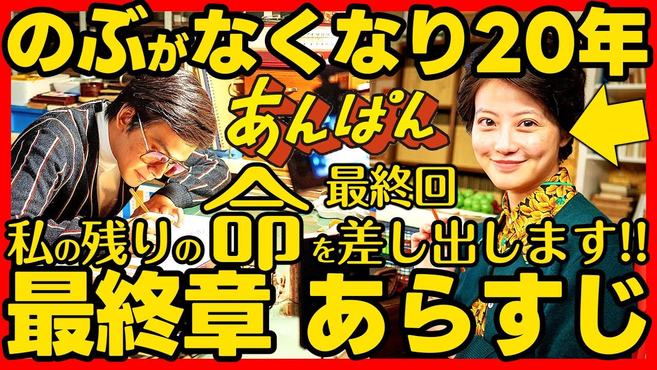いよいよ最終の最後まであすを確認する ことになります。この動画の最後では 矢瀬孝志先生やアンパンマンが打ち立てた 記録についても確認していきますので最後 まで是非お付き合いくださいね。9月22 日月曜日から1週間放送される予定のアン パン第26周最終の内容を先取りしつつ僕 の予想と考察を含んでお話していきたいと 思います。NHK連続テレビ小説安ドラマ 考察。この動画のコメント欄に感想を 書き込んでみんなで気持ちを共有し ましょう。このドラマについて過去に公開 した動画をコメント欄にある再生リスト から見ることができます。 解決アンパンマンのミュージカルは正強で 幕を閉じました。ノブはミュージカルの時 写真をたくさん撮っていましたが、それは 見に来ていた人たちの写真がほとんどです 。 どんな表情でマを見ていたか、たへも見せてあげたい、記録しておきたいと思ったんでしょうね。その写真を見ていたしはトみ子の写真に驚きます。た志には何も言わずに見に来ていたようです。アニメ映画優しい音はトみ子は 1 人で見に来てましたね。は子と一緒にっている姿をぶが撮影していました。 自分の作品を笑顔で見てくれるなんてとし は驚くようです。 畑子とのぶは思い立ち、トみ子を誘って 高知へ旅行に行くことになりました。その 計画を立てている時、たの担当編集者が やってきます。アンパンマンは親御さんや 自動文学の評論家から評判が良くないと いう話をその編集者がするとすごい勢いで 富子が起こりました。アンパンマンが教育 上よろしくないですって。その姿を見た は子はのぶに対してトみ子さんとのぶは よく似てるよねと言いました。のぶは 嬉しいんじゃないでしょうか。言いたい ことを素直に言うとこにシンパシーを感じ ていたところがありそうですし、またト子 をしうからこそト子から佐藤も学んだん ですよね。 ノブは旅行の荷物にアンパンマンの絵本を たくさん詰めてごめ予長の人たちへ渡す つもりでした。アンパンマンはた志との 子供。そのアンパンマンが子供たちを喜ば せてくれる。 のぶは畑子へお母さんの幸せって何と聞き ます。畑子は娘たちの母親になれたことだ けどそれは2番目で1番はゆ太郎さんの 尿房になれたことと答えました。あの世で あった時年を取った自分に気づかなかっ たらどうしよう。ゆ太郎さんが残りの命を 自分にくれたから長意気できたのかもしれ ない。優しい人だったからとゆう太郎の 帽子を見つめながら畑子は涙を流しました 。 旅行から帰ってきた後、た志は愛すべき 悪役が必要だとハエのようなキャラクター を書いていました。ノブに名前を聞かれて 高志はバイキンマンと答えます。この 可愛くないキャラクターがノブはまた気に 入ったようです。 それから2年が経過して1978年昭和 53年キリオでの部ランコ ヤギが話していました。どうしてあの キャラクターが生まれたんですかと バイキンマンのことを聞くランコ。みんな が同じものを見て同じような発想をする 世の中は危険。そんなの嘘っぱちやとのぶ は昔乱こから言われたことを思い出します 。周りに流されてその色に染まってしまっ たことがあるというのぶ。そんな時代に 戻らないように書き続けてほしいと高志は 言われますが、 それを聞いていたヤギは思い悩んでいまし た。 もぶもランコも戦争を自分のことして考えている。だけど自分はランコから戦争 体験の取材を断り続け合うことを避け続けてきた。このままでは卑怯者になってまう。そしてヤはランコの材を受けることを決意しました。ヤ木はランコへ戦争 体験を詳しく語ります。 うずくまって震えていたこと。重で敵を 指し、相手の命が失われるのをはっきりと 感じたこと。そのまま朝を待っていた時、 殺した相手のポケットからその人の妻と 子供の写真が落ちてきたこと。40年前の 記憶が生々しい感情となって蘇ります。 ランコは震えるヤの手を両手で進み込み、 何も言わずに抱きしめて、そしてヤは乱こ の胸の中で声を押し殺して泣きました。 傘のシーンではヤギがランコの手を上から 握ってましたよね。ヤギさんを抱きしめて くれる人はやっぱりランコでした。ヤは 40年間自分の胸にしまい続けたことを ランコには告白することができたんですね 。 手島おむからキャラクター作りの才能が あると言われていた志はその才能を発揮し てどんどんキャラクターを増やしていき ました。カレーパンマン、お結びマン、食 パンマン、バタコさん、ドキンちゃん。 ドキンちゃんのキャラクターはた志の お母さんのとみ子さんと聞いたメイ子に た志は気が強くて何があってもめげない 性格はのぶちゃんと答えました。名前の 由来はのぶを見るとドキンとするからなん だそうです。やっぱりのぶとこの性格は そもそも似てる気もしますよね。 それからさらに7年が経過した1985年 昭和60年アンパンマンをテレビアニメ化 したいとテレビプロデューサーの竹山が 訪ねてきました。だ