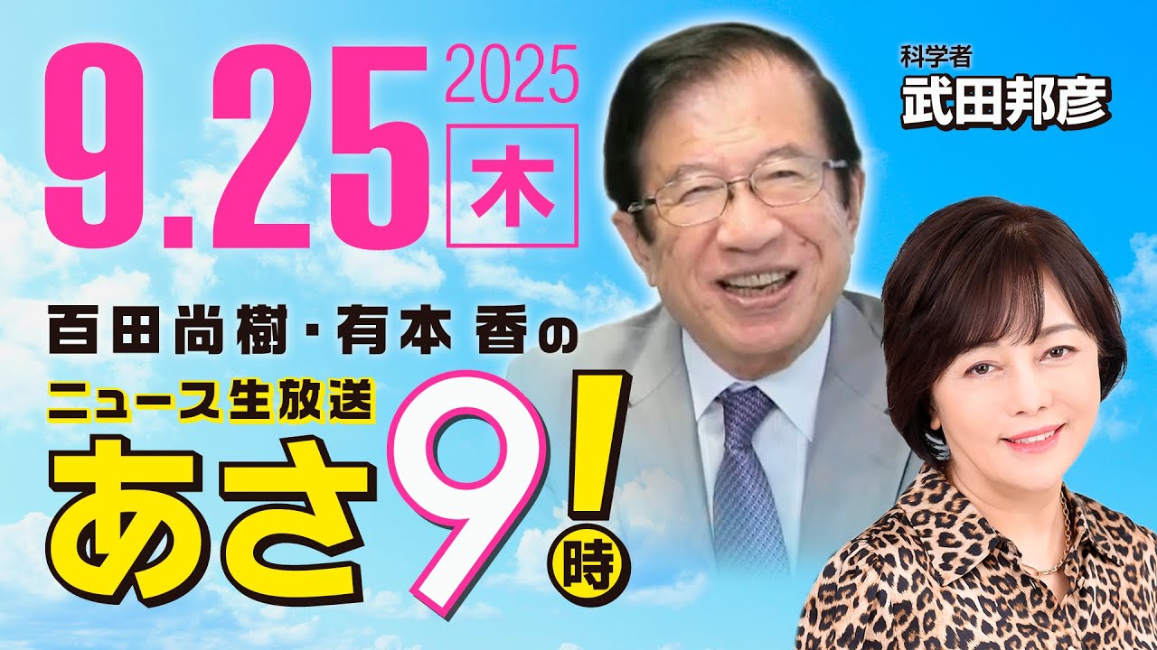 [音楽] おはおはようございます。日本の朝 9時です。令和 7年9月25日木曜日ニュース生放送沢 9 時スタートです。え、今朝はですね、え、この方にお越しいただきました科学者の武田国彦先生です。おはようございます。 おはようございます。 いやいや、先生なんかだいぶ涼しくなりましたよね。 ええ、急にね。 ええ、 ま、あの暑さんも日願までというね。快適ですね。 快適ですね。これから10 月にかけてはいいんですけれども。 えはい。 ただ、あの、台湾で、えっと、台風の被害が大変大きくなってるとで、これからちょっと台風シーズンでもありますよね。 ただ今日、あの、今年は少し配置が違いますから気圧配置が。 あ、そうなんですか。 今でも 今ま日本はもう 200日ぐらいとか2 日とかね、そういう時期でしょ。 ええ。ええ、 だからこう台風がちゃんとこう日本劣に沿ってくるのが普通ですけど、 ええ、 残念ながらまずいことに 台湾と中国の方に今 2つ はいはいはい。 それから太平洋の東の方に 1つ。 これで日本はすっかり晴れてるというね、 こういう、ま、あの、 稀れに見るあの気圧配置ですね。 丸に見うん。 ええ、ですから、今んところは台風が近づく気配はない。 うん。あ、日本が非常に高気圧なってて、 その周りをこうが通ってるってことですね。え え、 だ、中国はこのこんところ随分台風が多いもんですからね。中国大陸の方がね。え え、ですから、ま、引き続き大変なことになってるなと思いますけどね。 あの、以前はそれほど多かったっていう気憶がないんですけど、ま、ただ単にあの、向こうでの被害があまりこちらに報じられてなかっただけですかね。 はい。いや、そんなことないですね。 もうあの中国のに行かなくなりますからね。 だから全部こうこっちに来ますから。だから 15ぐらいからは 鹿児島あたりからこうずっとね太平に沿っていきますんでね。それが今年はもう全然違いますから。 ええ、ま、今年非常に暑かったつのは、 ま、チベと高気圧 全体的な後期圧の文法も違いますしね。 それから黒シオも違いましたんで。 うん。うん。 え、ま、あの、非常にそういう点では夏った分だけ 今助かってるとま、いうことですね。こちらには来ない。だから、ま、その台湾では相当なですね、えっと、死者も出ていますし、大きな被害になっているということでございますので、あの、もうその台湾でですね、被害に現れた皆様に心より お見舞い申し上げます。なんかね、日本でもやっぱ台湾にはね、随分助けていただいてるじゃないですか。え、 災害のたに。 この前の産新聞のから新編集部から、 えっと、台湾の方のね うん。 あ、書を送っていただきまして ああ、そうですか。 ええ。ま、随分日本も僕もあの、随分台湾に行きましたし。 ええ、高学ですけどね。 そうですね。あの、台湾のですね、えっと、ま、東側なんですよね。多分今回ね、え、被害受けてる地域が ですから本当にまあ、なんて言いますかね。 そう、そう。はい。あとはもう 1つ来ますしね。すぐね。え え、引き続きという感じでございます。まあ、日本でもだから日本に今んとこ来ないけれども、え、そうです。 これからまた来るかもしれないというところですね。そうです。 はい。ま、そういう状況ですけれども、今日のニュースのラインナップ行きたいと思います。はい、順に読んでいきます。 1高一市年収の壁上げ賛成。え、小林小泉 氏も所得税に言及と2トランプ氏地球温暖 化は起きていない。気候変動対策は市場 最大の詐欺。ま、私もこれに近い考えです けどね。3規制委員会の番委員退任。え、 東電2改善継続油断すれば元に4魚型の 醤油容器はい。はい。え、南 オーストラリア州がプラゴミ対策で禁止に と5太陽光パネルリサイクル義務か見送り 大案は努力義務 6デジタル教科書正式導入へQRコードも 検定対象 7最大125ドシでも重方電パナソニック パナソニックホーディングスえ子会社が初 出荷へ全個体電池8広がる原ール給食皆で 同じご飯の感動大炎上の裏にある第5回9 健康寿命男女ともに全国トップは長野 県女性は8年 10星党竹裕子議員離島届けえ 提出秘書金未疑惑とま 項目で今日はお送りしたいと思います。 はい。 はい。 今日は私の専門のところも多いですから、 どこでも大丈夫なんですけども、非常に重要なやつがあるんでね。 はい。 そこからやらしていただければと思っております。 分かりました。 はい。あの、でも一応ですね、え、 10 番のあの星島のニュースいきたいと思います。 はい。 え、10 番星竹裕子議員離島届け提出監禁水疑惑というニュースです。 え、Xのようやくニュースによりますと、 日本保守党の竹神裕子衆議院議員が等運営 への不満から離島届けを提出したところ。 東側は、え、受理を保留し、議員辞職を 要求。24日未議員会館の事務所で秘書 2人に対する解雇通知と監禁密の行為が 発生し、当幹部が警察への相談を表明し ました。離党の背景には当内