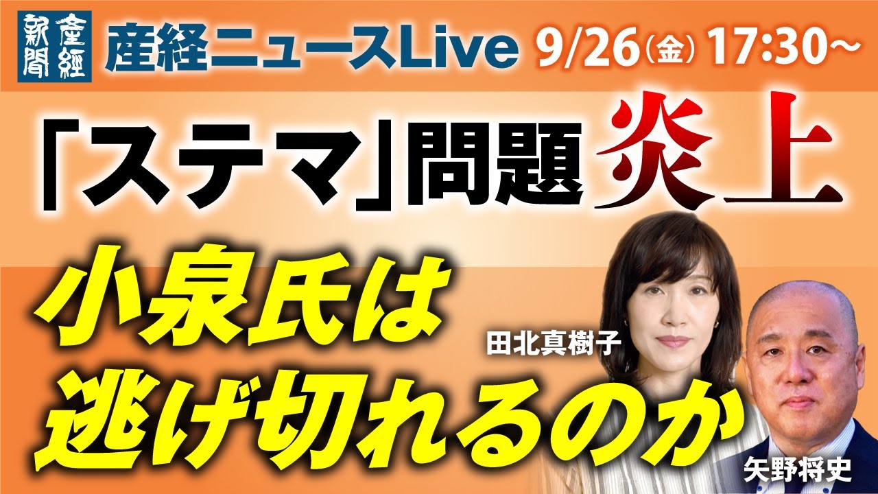 9月26日(金)17時30分~ライブ配信します。「ステマ問題炎上 小泉氏は逃げ切れるのか」をテーマに、産経新聞編集局の田北真樹子特任編集長と矢野将史編集長が語ります。