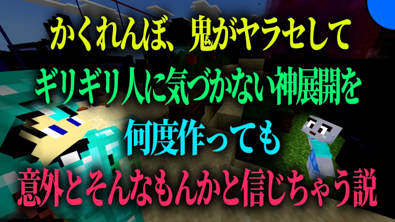 かれぼ鬼がやらせしてギリギリ人に気づかない紙展開を何度作ってもプレイヤー側は意外とそんなもんかと信じちゃう説。 こであのかれ棒を行います。 うわ、 隠れ楽しそう。 隠れる側には適当な理由をつけてそれぞれの視点を限定公開で生配信してもらい鬼はそれを見ながらプレイヤー側の位置を常に把握しながらゲームを進行。鬼はやらせを怪しまれるまでプレイヤー側にやらせの神回避を提供し続けますと。 最大1時間隠れられたら勝ちです。 5 分間下いときます。その間にいいかける場所を見つけてそこに隠れてください。それでは逃げてください。 はい。逃げ。 [音楽] さあ、始まりました。ま、バレないとよかったらだんだんレベル上げようと思うんで人の配信見ますか。ちょっと 監禁されてもいいんじゃないかなって俺思っていて。 何を言ってるのこの人は?マシンクラフト何時代の機会?バレバレバレですね、これ。 座標が いや、これ、これはさすがにバレんでしょ。こ れでも神だと思う。面白いと思いますね。さん スキンの色が さあ、ということで始まりました。まず誰のとこ行きますか? 1番近い人誰だ? 行きます。 あ、まずサクさん行くか。じゃあまずはそんなこともあるかっていうぐらい低レベルの回避をしてもらいます。 いや、でもさんカするてやっぱり結局あの 1番最初に捕まったやつ 大らせ移動 大らせ移動始まりました。あそこですね。 さあ、ちょっと行きましょう。あ、いたい たいたいた。IDが見える。IDが見える 。やらせんで。IDが見えます。鬼側は 横通りますか?まずはまず素通りし ましょう。 まず 素通りで行きましょう。さあ、います。います。さあ、素通りします。さ、な、何て言ってるかな?な、何て言ってるかな?これ [笑い] 誰かと一緒にしん。なんだ?今、今誰かいたか?いないよね。よかった、よかった。一瞬なんか誰かがいたような気がしたけど。 来ました。 あぶねえ。マジかよ。 怖ええ。嘘でしょ?結構足音でかいな。バレるな、これ。移動すると [笑い] 成功です。よかった。成功した。ミを考えてない。やらせとわ。自分が回避したと思ってる。次じゃあ誰行こうかな?じゃあ。 うん。ま、別にトナカに譲ってあげたけど。いや、あそこは悪い物件だよ。あれ絶対。 これからさ、行きましょう。さあ、向かいます。あそこにいます。第 2ラウンド。マジ楽しみだ、これ。やっぱ 人間ってやっぱ自分が有利な展開になると やらせを疑わなくなるんですよね。いまし た。あそこにいましたね。おこにかさんが でこっち行って。よしよしよしよし。 さ、なんて言ってかな。あ、やばい。いる いる。あ、やばいやばいやばい。いるいる 。 耐えた。本当にちょっと待って。 本当に本当なんかえ、一切っち見なかったんだけど耐えた。よしよしよしよしよし よし。成功です。 両方もアホよの本当に。うん。こっちに気づかないとは。全然だめ。視野が狭い。 よしよし。成功です。チャオルさんいますね。さあ、おかしい。おかしい。あ、あの人動画だから。 あの人配信できてないからちょっと後で 運びましょう。ああ、 生きてる。 うわ、耐えた。耐えた。危な。もう1回。 もう1回やっとこ。さクさん。さくさん。 もう1回ほどもっと真横。真横通過しよう 。 来たぞ。うわあ。やってんだろ。やってるよね。 [笑い] まずい。 え、やってるよね。 あ、バレましたね。さす 本当に行ってる。 さすがにバれた。よし、じゃ殺そう。 いやさあ。 [笑い] やばい。来た、来た。 え、え、え、え、え、は、は、いや、見ただろ。見ただろ。よっしゃ、じゃあ、じゃ、サクさ、サクさんだけネタしにしに行きましょう。さ、ということで、サクさん、お疲れ様でした。 [笑い] あ、お疲れ様です。 今日の企画なんですけど、あの確棒であの鬼側がやらせして永遠に気づかしても意外とそんなものだと信じちゃう説っていう。 [笑い] おい、やっぱそうじゃねえか。俺途中から怪しがっただぞ。 最初1回目っちゃ喜んでましたね。 あ、待って。見られてんの? そうです。そうです。そっか。そっか。 そう。 さあ、出発です。と中さん、これワンチャン。これ真横すぎ去ってもいけるぞ、これ。よし、じゃあ行きます。 過ぎ去ります。こ、こ、過ぎ去ります。さあ、過ぎ去ります。じゃあ、 ドラえもん。ドラえも うわ、あのバレてないな。 ドラえもン すごい。うわ、これ厄介になってきたな。 20分経。 このやらせ確れぼでは20 分経つごとに鬼が5 分停止し、その間に別の場所に隠れてもいいというルール。 変えてください。スタート。じゃあ誰にしよっかな。 [音楽] じゃあ次はあ、なんか違う場所にいる。 ウーパルパいる。スタート。 クイズ大会乗っか。海入って泳ごう。泳ぎろ。泳ぎ室通りしよう。いますね。いますね。いますね。さあ、これでバレたか。どうだ? [笑い] ちょっとじゃあドラフトの話でもしようかな。 いえ、いる。やばい。 いるいるいるいるいる。いえ、奇跡だろ。これ気抜かれな