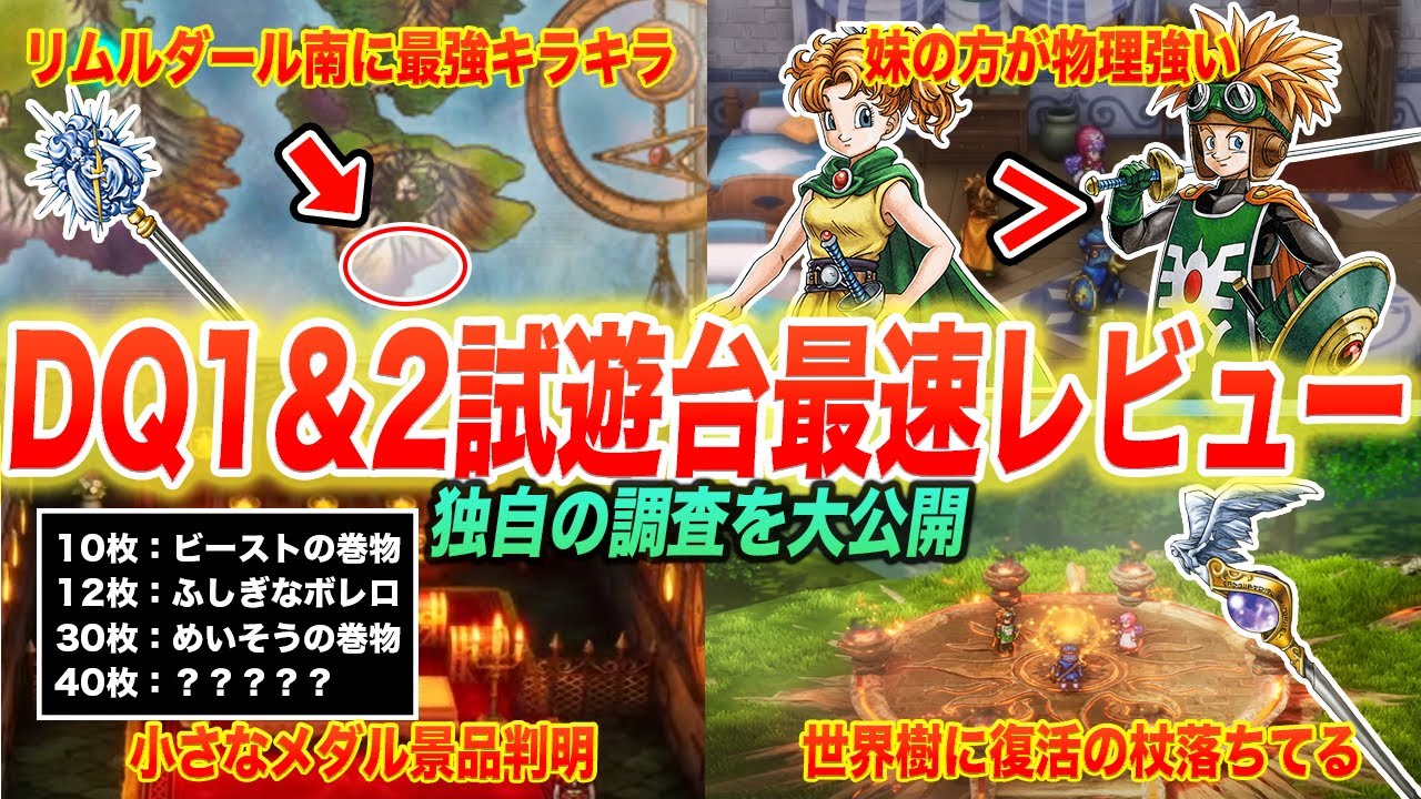 とびんです。9月25日から東京ゲーム賞 が開催されました。そこでドラクエ12の リメイクの支ができるので最速で遊んで まりました。集台は1回15分遊べて 並び直すことで何度でも遊べます。という ことで今回はワン2をそれぞれ3回ずつ計 6回遊んできたので今回はそこから分かっ たここでしか聞けない生の情報をお届けし ていきたいと思います。ちなみにドラクエ 1はレベル10のデータでガラから スタート。始まった瞬間これまでの情報で も言っていた盗賊の鍵のイベントが始まる まさに序盤。そしてドラクエ2はなんと 全員レベル31でベラヌールからスタート 。テパやロンダルキアなどを除くほぼ全て の場所が最初からルーラ登録されており、 かなり終盤よりのデータでした。それを 踏まえた上で1つずつ見ていきましょう。 まずはドラクエ1から。ドラクエ1はガ来 の序盤からですので、本来は南に行って 盗賊のイベントを進め、岩山の洞窟で神田 を倒したりというイベントをやる流れなん ですが、別にそれをやったところで新しく なってたと言われても皆さんそりゃそう だろうであんまり面白くないと思いました 。これよりはこれまでのドラクエ1から どう変わったのかが重要だと思います。 ですので今回神田イベントは完全に無視し てアレフガルドを行けるところまで探索し てきました。ルートとしてはリムルダール 方面とメルキド方面です。序盤とはかなり 自由度が高く面白い情報になっているかと 思います。リムルザール方面からいき ましょう。まずはキラキラがドラクエ3 より圧倒的にしょぼくなっているです。 ドラクエ3のHD2リメイクは物語序盤 から終盤までキラキラの中身がめっちゃ 豪華でしたよね。至るところにあって拾う と高確率でその時点でだいぶ強めの装備が たくさん手に入るのでお店で武器防具を 買うという楽しみが減っていたと思います 。どういう理由からなのか。今回ドラクエ 1共にキラキラの数が圧倒的に減ったよう な気がします。そしてキラキラがあったと してもほぼ消費アイテムです。満月層、 条約層、ドーピングアイテムなどですね。 なので前みたいに武器や防御が完全に不要 になるということはなくいい感じに調整さ れたような気がします。でもそんな過法 修正されたキラキラの中にも強力なものを 見つけました。これはもうドラクエ1最強 ムーブに入れてしまっていいような気がし ます。それは物語が始まったらガラとかに 行く前に全逃げでリムルダールの南にある 虹の雫を作る祠付近に行きましょう。実際 沼町ちの洞窟ではイベントが起きるだけで 普通に最初から通れるっぽくて、今作 オートセーブやルーラ地点がかなり増え てるので現実的だと思います。で、そこに 何があるかと言うとレベル1で入手でき たら強すぎる武器防具が眠っています。 まず1つ目は天罰の杖。これは祠の南の 毒ドの街あたりのキラキラで拾えます。 攻撃力は55くらいでトゲの鞭や鉄の槍り 鋼の剣するよりも全然強いんですがその 進化は道具仕様のバギマです。賢ゾーンか どうかは分かりませんが主人公レベル10 で使ってみてその辺の敵に80ダメージが ポンポン出ました。これが入手できたら だいぶ序盤は無双モードだと思いますね。 そしてその毒の沼ちのキラキラの位置から 北頭に秘密の場所が見えます。ここの樽 からは手のベストが入手できました。 ベストとはいえ守備力は50近くあり鉄の 鎧いなどより圧倒的に植え。さらに素早さ も230くらいは上がったはずなので超 強いです。ちなみに見落としが多少あるか もしれませんが、リングダールエリアには 他に目ぼしいキラキラ秘密の場所はあり ませんでした。ドラクエ3の時はアリア ハンから出ずにトゲの鞭ムーブを発売 マインに提唱しましたが、ドラクエ1の 最強ムーブはまずこれらを入手しに リムルダールをルーラ登録しつつ全逃げを かすというものになりそうです。続いて リムルダールの鍵やの扉に鍵がかかって いるです。ドラクエ1ではリムルダールの 外観をぐるっと上から回ったところに 鍵屋上があり、鍵を使って鍵つき扉を 開ける方式でした。ですが、今回ガラや 周りのイベントで盗賊の鍵が入手できます 。となると一見鍵がおめになりそうですよ ね。なんですけどドラクエ1世界には赤い 宝箱、青い宝箱、緑の宝箱が存在します。 それためまず神田のイベントを済ませて 盗賊の鍵を入手した後、リムルダールの鍵 の扉を開けることで宝箱を開けることが できる鍵のイベントが発生するんじゃない かなと予想します。3種類の宝箱があるの はドラクエでも今作が初めてなんで、どの 色の宝箱にどんなものが入っているのか 楽しみですね。ビムダル方面はこれで終了 です。次はメルキド方面に行けるところ まで行った時に判明したことを見ていき たいと思います。まずはガイの南にある橋 の前に街道の宿屋というスポットが追加さ れていました。ここを通らないと橋が渡れ ないという感じの石書っぽいやつで
