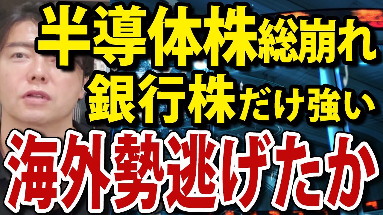 はい、じゃあかゆ岡です。というわけでね 、え、今日はですね、え、権利付き最終日 ってことで、今日ですね、え、配当出す ですね、9月末配当をですね、え、銘柄を 買っていればですね、え、一応権利が もらえるといったね、日になります。なの で、え、ま、個人投資家のですね、ま、 配当を狙った買入りやすいんですが、ま、 今日1日だけを見るとですね、300円 近くですね、根を下げまして、当然足は ですね、え、非常に下げやすい日になるん じゃないかなと思いますし、ま、先物の方 もですね、200円近く下がってますので 、ま、京都じゃないね、週明か週月曜日、 月曜日ですね、明日明後日と土日を挟み まして、え、そちらの方がですね、え、仮 ま、今のとこ下げ物下がってますけども、 もっと大きく売り込まれる可能性もあり ますよね。え、そうすると500円以上、 2日でですね、場合によっては、あ、ま、 800円とかね、え、下がっていく可能性 もあるので、ま、ちょっと警戒が必要か なっていう、ま、流れになってます。ま、 もちろんうん、配当ね、え、またになり ますから、ま、下げやすいといえば下げ やすいんですけども、ま、その辺りの解説 とですね、え、あとはね、え、AIですね 、え、の株が今日こぞって大きく売られ てるんですよね。ま、この辺りの、ま、 動き、それから、ま、注目株であったりと か、え、今後の経済級のね、え、動きなど ですね、え、など、ま、解説をしていき たいと思っていますので、よろしくお願い します。じゃ、早速ですね、本編の方に 移りたいなと思うんですが、その前にです ね、私に成りすましは、私の成りすましが ですね、非常にね、え、多くなっていまし て、え、会社の方にもですね、え、 問い合わせが非常に増えてます。で、私に 秘書はいません。うん。欲しいぐらいなの でね、私の髪の衣装と語ってるものは全て 詐欺です。そして、今熟成も一切募集して ません。年に1回なので、次は来年になり ます。ま、一応ね、成し市があまりにも 多くて問い合わせが増えてるので、もう 来月には、え、10月にはですね、 ちょっと先行の告知はしますけども、もう 年に1回なんですよね。なので、今募集し てるものは全部詐欺なので、え、気をつけ てもらいたいなと思ってます。そこの YouTubeチャンネルでしか、え、 案内はしませんので、え、是非ね、え、 そちらの方お待ちいただきたらなと思って います。大丈夫ですかね?じゃ、早速本面 の方にね、え、じゃあ映りたいなと思うん ですが、今日が県立最終日になりますね。 で、土日を挟んで権利ですね。で、ここで 、ま、売ってもいいんですよ。なので、え 、売りが続出すると思いますね。で、 先ほども既でに200円近く下がってます けども、ま、最終的には4500円ぐらい 下がるんじゃないかなと見込んではいます 。うん。ま、もちろんわかんないですけど ね。うん。ま、そういった流れになるん じゃないかなとは、あ、予測はしています ね。で、今日は、あ、ね、え、300円 近く下がりました。で、トピクスだけはで もね、上がってます。そう、トピちゃん 今日強かったんですよね。うん。で、これ はね、おそらく2日経平均を支えていた AI反動体関連株が今日1日だけで ものすごく売られてるんですよ。え、 10%高くね、え、下げ、根を下げてる ものもあります。一方で銀行株が強い強い んじゃということで、え、今日1日だけ 来ると銀行株こぞって上がってるんですよ 。もちろん高配当株ね、え、銀行株非常に 多かったので、ま、狙われやすかったと いうのもあるかもしれないですけども、 あと利上げ期待ですかね。うん。ま、それ から割安銘柄が非常に多いのでね、銀行 セクターね、未だにそれからまだあります ね。え、千葉銀行と千葉工業銀行かな?あ 、この後ちょっとニュース紹介しますけど も、この辺りの、ま、あの、いわゆる、う 、ま、合併と言いますか、あ、ね、え、の ニュースも2日経から出ましたので、え、 この辺りも交換されたんじゃないかなって ことで反動体株が下がって、え、地銀を 含めた銀行株が上がったのでトピックスが 強くて2日2件平均が弱かったといった、 ま、流れだったんじゃないかなとは思って います。で、今日はね、え、ま、下げまし て、あと円安が非常にね、え、進んでます ね。うん。ま、ちょっとね、え、その話に 行く前にですよ。金融経済の動きを紹介 する前に、え、まずはね、え、今日1日 だけで大きく下げた反動対株を見ていこう と思うんですが、まずはね、当はですね、 え、今日10%近くの下げですね。ま、 10%超えか非常に大きく下げていますね 。それからレーザーテックも8.36% って形で根を下げました。そして、え、 な、何だっけな、これ?え、す、すみ子 だっけな。あ、忘れちゃったな。すみ子。 すみ子であってんのかな?え、あ、つたか な?間違テロップ出しときます。うん。 すみ子、ちょ、女の人想の名前みたいな 感じだっけなと。