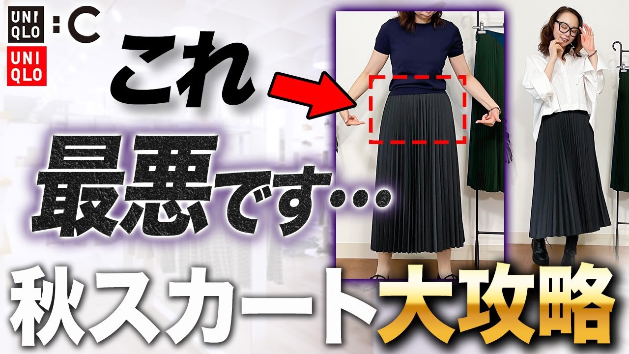 スカートを似合う人と似合わない人の特徴 というところで言うと [音楽] 試着室はマジックボックス。皆さん こんにちは。スタイリストの辛しカおる です。はい、今日はね、こちらにも並べて おりますけれども絶対失敗しないプリート スカートに合うサンライトトップスという ものをお話ししていこうと思います。はい 。え、ま、プリンツスカートはね、今焼き たい、使いたいっていう風に思われる方 多いんじゃないでしょうか。ま、別にね、 そのトレンドとかではなくって、ま、いつ でもお見せいただけるものなんだけれども 、ちょっとね、ま、今回のね、ユニクロシ え、のものもありますし、色々取り揃えて みましたが、え、注意をしなきゃいけない ものっていうのもね、ところていうのも あるんですよ。じゃあ、どんなところを 注意して、しかもね、会うトップス3つは どんなものがあるのかっていうのを是非 最後までご覧いただいて面白かったために なったと思っていただけたらチャンネル 登録いただけると嬉しいです。それでは 行ってみよう。 はい、それではね、まずどんなものをご 用意したいのかご紹介したいと思います。 はい。まずね、1番手前にあるのは、ま、 先日もね、ご紹介させていただきました 今期のユニクロCの、え、ブリーツ スカートなんですけれども、 ブリーツロングスカート55番のグリーン です。100%ポリエステルで、え、L サイズ4990円の、え、私が購入しまし た。はい。いかがでしょうかね。なかなか ね、今回のね、色にすごく迷ったんですよ ね。私も黒とブルーが綺麗だったんだ けれども、また来るかなっていう風に思っ てしまったのでね。え、かと言って、え、 ワインカラーとカーキーも綺麗なんだ けれども、ちょっとその2つの色があまり にもちょっと反対色っぽい感じがして、え 、躊躇してしまって、こちらに、え、 落ち着きましたというところなんですけど 、これね、着た方が素敵だっていうのも もちろんあります。で、今回ね、ま、 ポリエステル100%なんですけれども、 ちょっとね、素材的にな、何て言うのか 知らね、着物っぽいというかね、チリ面の ようなそんな感じのクレープジのような そんな感じのね、シックな感じの素材で ございます。割るとね、しっかり落ち感が あるっていうところが特徴でございます。 はい、続きまして、こちらの、え、 ユニクロCの去年のはい、プリーツですね 。去年の秋冬のプリーツなんですけれども 、こちらのね、イエローとオフホワイトに プラス、え、ブラウンとベージュ、 ちょっとね、ぽっくりとした感じのキャメ ルっぽいベージュ、それからなんか黒、 ブラックがあったんですけど、ブラックと 今年っぽくブルーだったのか、ちょっと そのそこは記憶にないんですけれども、 とにかく前回も3色出ておりました。はい 。ブリーツカラーブロックスカート。え、 私が購入したのは41番のイエローで ございます。で、こちらもね、え、 ポリエステル100%なんですよ。複合 繊維のポリエステルっていうものも38% 入っているんですけれども、同じくL サイズ5990円です。え、金額的にね、 今年の方が1000円下がって るっていうのもあるんですが、こちらね、 結構しっかりとした感じのね、左点っぽい 感じのスカートなんですけれども、割とね 、ちょっとこれは、え、針感のある感じが しますので、落ち感はあるんだけど、多少 の針感もあるというようなスカートで ございます。はい、続きまして、こちらは ユニクロさん。はい、ユニクロさんの オリジナルのプリンツスカートなんです けれども、こちらはね、え、アンブレラ ブリーツスカートですね。なかなかね、色 がすごい素敵なのと、大体ね、ご覧 いただいて分かるようにブリーツスカート トって割と艶感のあるものが結構多いん ですよ。その中で、ま、マットな感じって いうのかな、それはね、ものすごく履き やすいし、ちょっとウールっぽい雰囲気に なっているので、このポジションが69% ポリエステル、29%レイオン、2% ポリウレダンというものなんですけれども ね、ちょっとこれね、お持ちの方は結構 多いと思うんですよ。結構数年にわたって 販売されていましたので、ちょっとね、 フラノというかね、ウールっぽい雰囲気な んですよ。なかなかこういうね、素材は、 え、ユニクロさん得意じゃないかなと思い ます。割とね、フリツの幅が少しあ るっていうのもしっかりした素材だから こそちょっとね、針がありやすいっていう ようなものでございます。はい。最後、 はい、こちらですね。こちらは日辛しと、 え、アトリエヌさんのコラボのプリズ スカートなんです。はい。これもちょっと 光沢感があるんですけれども、黒なんです ね。で、え、このようにレースがね、下に 施してあって、ちょっとね、歩いた時に ヒラヒラって、え、足元がけて見えると いうね、はい、動きのあるものでござい ます。イレギュラーヘムプリンツ、え、 スカート