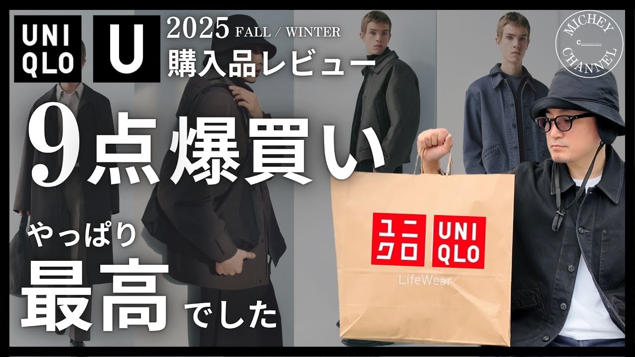 [音楽] はい、皆さんこんにちは。ミッチー チャンネルの達です。いつもご視聴 いただきありがとうございます。ついに 本日ユニクロUの2025年秋冬の商品が 発売されましたね。ま、これに関してはね 、オンラインの予約のタイミングから すごく気になっていった方も多いんじゃ ないかなっていう風に思いますが、そんな 今日はね、僕も朝から買い物に行ってき ました。で、ま、皆さんもね、そうかも しれませんが、ま、正直に言うと、ま、 事前情報を見る限り、ま、素材とかね、 雰囲気とかは、ま、いつも通りかなって いう風に思ったりする反面、ま、ぱっとみ ね、ちょっと気になるっていう洋服が結構 多かったんじゃないかなていう風には思い ます。ま、質感も含めて1度ね、試着して みないと分からないなていうところから僕 自身もそこまで本護知れて考えてはい なかったんですね。で、ま、実際にね、 買い物してみて思ったことはやっぱり可能 であれば、ま、事前にね、試着して購入 できるのが1番いいかなという風に思った コレクションでしたね。まあね、そんな ことを話してる中でも、ま、実際に サムネイルだったりタイトルとかで、ま、 9点を爆害してるっていう情報は出ている かなという風に思いますが、ま、打ち訳け で言うと新規で6点でオンラインの注文で 3点、合計9点という形で購入しており ます。ま、正直ね、ま、いるかなとか着る かなっていうところはさておき、実際に 普段機できたいなっていう風にね、ま、手 に取って試着してみると、ま、イメージが 湧く、ま、そんな洋服が結構多かったん ですよね。で、例えばね、ニットとかで 言うとこれまで発売されてきたサイズ感 みたいなところと若干違うんですよね。ま 、個人的にはね、そこが結構すごく新鮮 だったっていうところで、ま、たくさん 買ってきてしまったっていうような流れに なってます。もしかしたら実際に手に取ら れた方は同じように感じた方も いらっしゃるんじゃないかなっていう風に 思ったりはしますね。はい。そんな僕が 今回購入した洋服はこちらになります。今 ね、スペースを開けて3つ表示させている ものは1つ前の動画でアップしたオン ライン予約販売分になります。もしね、 この予約分についてご興味ある方に関して はこちらの動画ご覧になっていただけると 非常に嬉しいなという風に思います。では ね、ちょっと今回多いので順番にサクっと ご紹介していければなという風に思います 。はい、今からちょっと準備したいなと いう風に思います。はい、それではね、 まず1点目ご紹介していこうかなという風 に思います。え、ブラッシュドスエット ハーフジップシャツというような商品に なってまして、購入したカラーについては 08ダークグレーを購入してまして、 サイズはMサイズ、今回Mサイズね、選ん でおります。で、え、商品の特徴を簡単に 言っていこうかなという風に思うんですが 、え、両面機能の、ま、お馴染みの ブラッシュジャージーかなっていう風に 思います。で、あと裾と袖口にリブがあっ て、ま、スポーティーなデザインの、ま、 よくあるハーフジップのスエットかなって いう風には思います。はい。で、結構リブ もしっかりしている分、ま、来た感じで 言うとちょっとね、針感があるような そんな素材感になってましたね。はい。ま 、これに関しては結構ベーシックな形なの で、ま、ご自身の着方というか、ま、期待 格好によってサイズ選んでいただくのが いいんじゃないかなっていう風には思い ます。はい。サクサク行きたいなという風 に思います。お次が2つ目ですね。次は ツイールワークオーバーサイズというよう な商品になってまして、え、購入した カラーは69ネイビーでサイズは今回S サイズ選んでおります。で、え、特徴を 言えば結構ね、襟りが大きい形になってる んですよね。どちらかといえば、ま、こう アウターシャツ的なイメージかなという風 に思うんですけど、ま、ポリエステル レオンの、ま、ビキモ素材のシャがいいん ですかね。はい。で、あとは、ま、細かい ところで言ったらこうダブルステッチだっ たり、ステッチの色のがこちらネイビーに 関してはブラウンになってたりと、ま、 単色のね、シャスとは少し違った雰囲気で 着用できるんじゃないかなっていう風には 思ってますね。で、これも実際に切ると 結構たっぷりしたサイズ感だったので、ま 、アウターっぽくリラックスした感じで 期待いんであれば、ま、Mサイズもいいか なっていう風に思ったんですけど、僕で 言うと結構ネルシャツツっぽい着こなしが したいなっていう風に思ったので、どちら かと言えば結構ジャストより切れるS サイズを選んだっていう流れになってます 。はい、お次は3点目に行きたいなという 風に思います。え、商品名がダブル フェイスフルジップジャケットで、お色が 07グレーでサイズは今回Lサイズ選んで おります。後ほどね、着用感見ていた