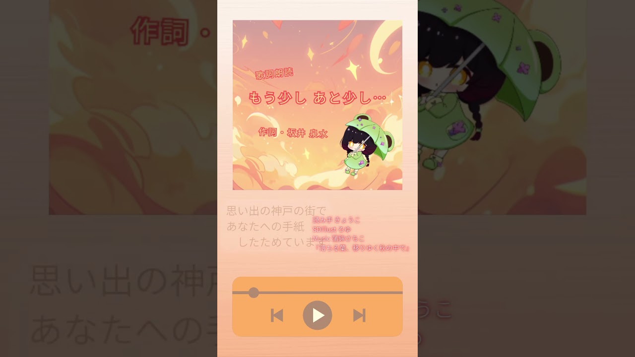 もう少し、 あと少し 作し、堺、泉、 気まぐれな9月の雨 傘の少女がすれ違う。 探してた2人の報え。 今はまだ知りたくない。 あなたのゆりかの中 そっと眠りたい。 心に秘めた涙は もう少し あと少し 愛されたい。 いけない恋いと知っても もう少しあなたのこと 困らせたい。 この愛 止められない。 思い出の神戸の街で あなたへの手紙 忘れようと何度もしたわ。 その方が楽になれる。 追生まれ た家を見てきました。 なんだか切なって 懐かしかった。 もう少し あと少し そばにいたい。 叶わぬ夢と知っても。 そう。少し あの人より 出会う時が 遅すぎただけなの。 もう少し あと少し 愛されたい。 いけない恋と知っても もう少し あなたのこと 困らせたい。 この愛 止められない。