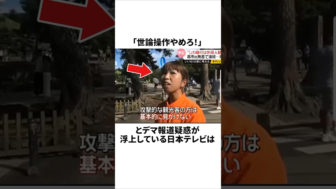 世論操作やめろと魔法同技疑惑が浮上して いる日本テgt定日は奈良公園での インタビュー映像がある物議及び呼び大援 している。9月29日日本テレビ ニューセブリーで総裁戦に立候補している 高一師が鹿を受ける外国人がいる奈良の鹿 暴行問題に言及したことを取り上げ外国人 が鹿をいじめているのを見たことがあるか 奈良公園で取材を観を10年以上努めて いるこの女性は攻撃的な観光客の方は基本 的には見かけないと答え高一の発言が事実 ではないように報道。しかしこの女性に 対してやらせで起用されているクライシス アクターではないかという疑惑が浮上。 実際にSNS上ではその人に似た女性が別 の報道番組に出演しているが像で回って おり、さらには奈良し会議員のへずもこの ガイドが本当に存在するのか現地で 聞き込み調査を実施すると長年働く人たち は口を添えてこんな人見たことない都会と 制服が不自然勤務中なら帽子をかぶってる はずなど違和感も指摘されこれにネット上 では極めて悪質な世論操作高一さんを 落としたくて必死だな放送倫理犯だろなど 批判が殺当支援上マスメディアへの不審感 を増大させる結果となっy