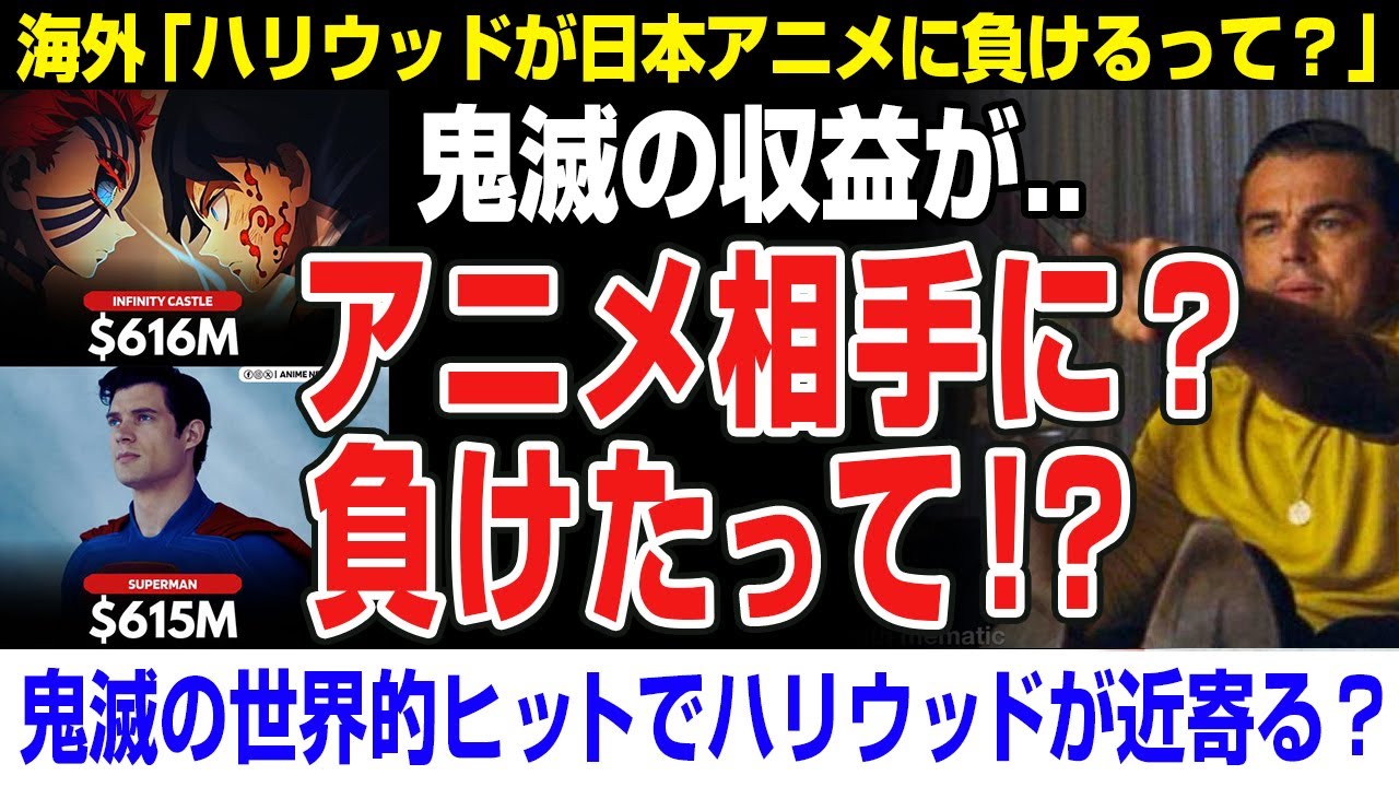 アニメ映画日本で人気なのは分かっている にしても全世界で公開されてスーパーマン を抜くなんて本当に大きな出来事です。 この出来事が鬼秘の刃とアニメにとって何 を意味するのか冷静に考える必要があり ます。まずこのグラフを見てください。 これが鬼滅の刃のごとの工業推移です。皆 さんこんにちは。劇場版鬼滅の刃無限上編 が北米で大ヒットしてると以前お伝えし ましたが、現時点での世界工業収入が とんでもないことになってます。 900億円を突破しました。とんでもない 数字です。これは日本初のアニメ映画とし て市場最高の数字であり、もはや一家性の ブームではなく、世界的メガ フランチャイズへと成長したことを証明し ました。注目すべきはこの数字がアメリカ 映画の象徴的存在を次々と超えている点 です。スーパーマンお抜きさらに富 クルーズ主演の待策ミッション インポシブル8思うは回りました。今年の 全世界映画を見てもとんでもない数字で 比較画像も海外で回って話題です。今日は アメリカのアニメYouTuberで ちびレビュー龍師がこの鬼滅の刃場の映画 人気に関しての動画が話題だったので紹介 します。他の人気映画との比較。そして この世界的な人気にハリウッドがアニメに 何らかの形で近寄ってくるだろうと予測し てます。鬼滅の刃無現状然世界で6億ドル を突破しました。2025年の工業収入 ランキングでトップに入る勢いです。鬼滅 の刃無限現状は今週末に全世界工業収入で 6億ドルを超えます。アニメ映画として 初めてこの数字を突っした作品です。各国 との工業収入の詳細は明日更新されます。 日本のアニメ映画がスーパーマンや今年の マーベル作品よりも多く稼ぐことになるん です。信じられない。そして今実際の数字 が出ました。数時間前の時点で無限は 6億600万ドルに達し、スーパーマンは 6億500万ドルです。これは鬼滅の刃 だけでなくアニメにとっても歴史的な瞬間 です。これはハリウッド映画の完全な拒否 反応です。そして西洋がメディアを扱って きたやり方そのものへの完全な拒絶です。 だって去年の夏を思い出してください。 ファンタスティック4やスーパーがどれ だけ話題になったか。 実際私も多くの人々がスーパーマンについ て肯定的に語っているのを目にしました。 そんな中でアニメ映画日本で人気なのは 分かっているにしても全世界で公開されて スーパーマンを抜くなんて本当に大きな 出来事です。 特に私の理解ではほとんどの人がスーパー マン映画をとても気に入っていたわけです から、ここで重要なポイントはこうです。 スーパーマンという巨大で歴史的な アイコンに比べたら鬼滅の刃はまだ10年 ほどの新しいシリーズに過ぎない。 それがスーパーマンを超えている。これは 本当に衝撃的です。でも話はここで終わり ません。この出来事が鬼滅の刃とアニメに とって何を意味するのか冷静に考える必要 があります。まずこのグラフを見て ください。これが鬼滅の刃の週ごとの工業 推移です。第8周目で急上昇をしているの が分かるでしょう?ほぼ直線的に 跳ね上がりその年のトップあるいはトップ 後に入っていた作品を次々に超えていった のです。例えばファンタスティック4を あっさり超え、その後も次々と追い抜いて いったんです。 そして今はもうスーパーマンを超えて次は ヒックとドラゴンに迫ろうとしています。 では今年の工業収入ランキングを見てみ ましょう。このデータは少し古いですが、 ファンタスティック4の工業収入は 5億2100万ドルでした。これは依前と してかなり立派な数字です。ですがこの 映画の実際の制作費を見てみる必要があり ます。下にスクロールすると予算は 2億ドル以上と記載されています。なので 周り駅はトントン程度でしょう。大体は 収支が吊り合った程度だったと思います。 次にミッションインポシブルは 5億9800万ドル 。制作費は34億ドル500億6億 です。これだけ巨額を投入したのに最終的 な工業収入はそこまで伸びず利益はあまり 出ていない。投資額に対して見合わない 結果だった。 一方で話題は秘密の刃場無限に移ります。 数字は少し古いが現在は6億700万ドル に達しスーパーマンを抜いてるんです。 これは大きな出来事だと断言します。ここ でスーパーマンの制作費を確認する流れに なります。これは比較する上で重要な ポイントだからです。スーパーマン映画の 制作費は2億2500万ドル。昨年夏の 公開時点では多くの観客から良い映画だっ たとな声が寄せられていました。もちろん 一部には否定的な意見もあったが全体とし てはポジティブな評価が多かったんです。 ただし政作費を考えると大成功とまではか ず黒字にはなったが圧倒的な大ヒットでは なかった。続いて鬼滅の刃の政策費に話を 移します。鬼滅の刃無限の制作費はわずか 2000万ドル約30億円でした。億測 それに対して現在の工業収入は6億ドル超 900億超え、つまり単純に計算すると およそ6億ドル900億超え利益を