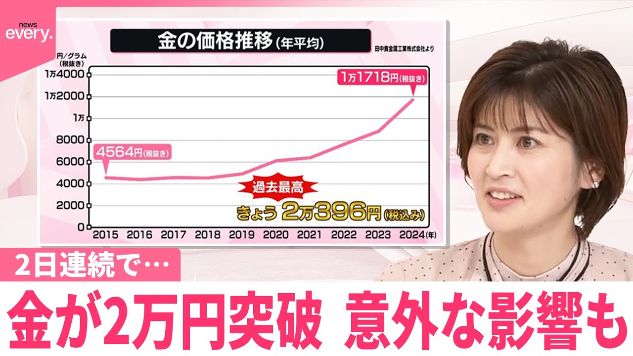 ニュースの気になる情報をお伝えするなるほどのコーナーです。今日のテーマはこちら。 なるほど。 金が2 万円を突破。意外な影響もということで、え、先週も金が最高とお伝えしましたが、あれからまた上がりまして 2日連続で2 万円を突破したということで斎藤さん金の勝ちが上がってますね。 ね。今やっぱりこう景がちょっとこう不安定な中で、ま、金を持っていくっていう方が増えてますよね。 はい。まさにそういうことなんですね。埼を更新しているんですが。 そう値段が上がってくるから金を売りたい という方がね、やっぱり増えてきてるよう で金を売っている、売りに来た人を取材し ました。 今日訪れた銀座の買い取り専門店です。 50代の女性が持ち込んだのは ブレスレット が2つ、指輪が2つの計5点です。さあ 斎藤さん え いくらぐらいになったと思います。 この 内容です。どでしょう?はい。 えっと、 30万円ぐらい。 ああ、30 万円。はい。鈴井さん、どれぐらいになったと思います? 50 万円ぐらい。 お、え、50万円ぐらい?え、誠、 あ、いや、いや、でもそしたら夢あるなと思ってしまっただけ。あ、ネックレス 2本、ブレスレット1つ、指輪2つ。50 万円で夢がある。正解はこちらです。 本日のお買い取り金額の発表させていただきます。 あ、発表。はい。 合計で93万円ですね。この 123 ゴールデントリームじゃないですか? 67000でございます。 はい。あり。 今日で良かったと思います。 あの、また上がるのかもしれないですけど 、まあね、ちょっと時間ある時に掘って 来れたので、ま、ブレスレットだけは新婚 旅行で買ったものですから、あ、ありまし たけど、でも娘もしないというし、あ、 なんか結局ずっと寝かしたままだったので 、ま、いいかなって整理しました。 なるほど。野さん93万円です。 何に使いましょうね。まだ私のじゃなかった。それじゃないです。 いや、でも本ん当夢がありますね。 ね。 というね、ま、あの、 売った方もね、びっくりするような金額になってるわけなんですが、金の価格の推移のグラフ年平均ですけれども、 10年前の2015年平均こちらでした。 4565 円です。1g、1g、 え、1g4564 円だったんですが、ぐーっとね、上がっていきました。昨年には初めて 1万円を超えた日がポツポツと出てきて うん。 これ2024年の年金が1718 円なんですよ。 で、昨日市場初めて 2万円を突破。今日咲かね、こちら 1g 2万396円と。へえ。 いうことになりますんで、え、およそ 10 年前に持っていた方何倍になったんだ? 4 倍以上になっているということなんですね。そりゃ売りたくなるよっていう気持ちもね、え、分かりますけれども、え、どうしてここまで金の価格が高騰しているのかということなんですが、ま、中東情勢が不安定になります。これ情勢が不安定になりますと、どうしても通貨の価値というのもね、不安定になってきます。 [音楽] そんな時にいわゆる安全とされている、比較的安全とされているこの金に資産を移すという流れが包まるわけですね。そうするとみんながあ、これはじゃあ安定している金を買おう。金を買おう。金が人気になってくると金の価値が上がってくるということなんですが、 金が値上がりしてるということでこの価格を受けていろんな変化が出ているんですね。ご紹介しましょう。 まずは結婚指輪ですが、鈴さん結婚指の定番の素材っていうと何ですか? え、プラチナと プラチナですよね。そうなんです。こちらの宝点一般的にはプラチナの指輪が人気だということなんですが、金を使った指輪を選ぶ人がおよそ 3年で1.5 倍に増えているということなんですね。 え、こちらの18金の指輪、ま、18 金というのはいわゆる金の岩油量が 75%のものを刺すんですが、低下が 17万6000 円ということで、ここ半年で価格が 23万円 へえ、 上がったということなんですね。え、さらに気少性が上がるイメージを持つというお客さんもいると今のうちに買っとこうということなんでしょうか。 さらにもう1 つ、金の価値高等、価格等に悩まされている日本の伝統光原があります。それがこちら西人折りですよ。 あの着物の帯などにもね、使われる高級素材のこの西人折りなんですが、中でも神社物格の装飾などにも使われている金というもの。これよく見るとこの糸がこれ金ですね。 うん。 はい。 京都の主の西人岡本によりますと、金迫の意図である本金士糸ね。この本金士の仕入れのコストがここ 5年で2倍以上に跳ね上がっている。 はい。 いうことになりますので、これ西人折りの売値ももちろん上げざるを得ない。 で、特にここ数年なんですが、日人より政策期間が非常に長くかかるものだと、見積もりの時、つまり作る時にはいくらぐらいで作りますよって言ってるんですけども、作ってる間、この時間の間に金の価格が上がっちゃうので、 売り値を設定するのが難しいと はあ、 いうことをね、言ってるんで、これも生産されてる方もなかなか大変ですよね。 コス