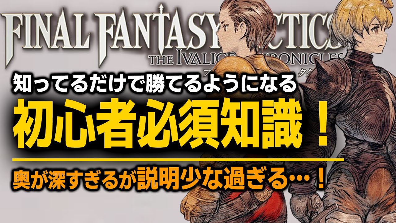 はい、皆さんお疲れ様です。けまいです。 今回はファイナルファンタジー タクティクスイバリースクロニクルズの方 で、え、初心者解説をやっていきたいと 思います。え、このゲーム結構難しいん ですよ。めちゃくちゃ難しくて、なおかつ システムがすごく複雑でですね、こう チュートリアルとかではなかなか語られて いないような、そしてまあね、知らないと わかんねえよ、そんなもんみたいな話が 結構多いので、そこを中心に今回は解説し ていけたらなという風に思います。ちなみ に僕もこのゲームやるのすごく久々で本当 に昔に、え、プレイしたっていう感じなの で、もし何か今回の解説の中で、ま、認識 の違うことを話していたら是非ちょっと コメントとかでも指摘もらえると助かり ます。ま、かなりガチ勢も多いゲームでは あって、昔からかなり親しまれてるゲーム でもあります。そんな、ま、上級者では 当たり前のことなんだけども、初心者には なかなか分かりづらいことを話していこう かと思うので、是非最後まで見ていって ください。はい、というわけで早速やって いきましょう。今回の動画では本当に ゲームシステムの基本の基本を解説して いきます。ただその基本も置く深いので、 え、知らないことたくさんあるんじゃない かなという風に思うんで、早速やっていき ましょう。はい。まずはですね、ジョブ ポイントJPの仕組みについて話していき たいと思います。え、戦闘で行動するごと に経験値EXPって、え、表示されてる やつとジョブポイントJPが手に入ります 。で、えっと、このEXPの方は キャラクターのレベル用。JPはジョブ 固有のアビリティ購入に使うという感じ です。だから、ま、いろんなキャラクター いますけど、え、キャラクターごとに経験 値っていう概念とジョブポイントっていう 概念2つを持ってるっていう風に考えてみ てください。で、例えばじゃあ黒魔同士で サンダーを覚えるんであれば、え、黒魔 同士で稼いだJPを使って購入する必要が あります。その時にJPっていうのはその ジョブごとに稼いでいくものなので、え、 黒魔同士が覚えるサンダーを覚えたいん だったら黒魔同士で出撃させてジョブ ポイントを稼いでサンダーを購入する みたいな流れが必要です。はい。ていう ことをまず念頭に置いておくと育成がグッ と楽しくなるんじゃないかなという風に 思いますね。はい。ま、ちょっと打速では あるんですけども、裏技的なものを紹介 するとこのゲーム味方も殴れるんですよね 。だから味方を殴ってジョブポイントを 稼いでなおかつその味方を回復するみたい なケアルを使って回復するとかまそんな 感じで無限に稼ぐみたいな手法もあるん ですけど、ま、序盤はとりあえず普通に 遊んだらいいんじゃないかなという風に 思いますね。敵とランダムエンカウントし てJPだったりレベリングっていうのは できるのでそこまでまないかなと思うん ですがこのJPの仕組みしっかり把握して おいた方がまずはいいポイントですね。 はい、続きましてジョブチェンジの仕組み です。各ジョブには解放条件っていうのが あります。例えばなんですけども、 黒魔導士をレベル2にすると時魔士が解放 されます。その他にもナイトレベル3 プラスモンクレベル4複数条件、この2つ を満たすと流騎士が解放されますみたいな 感じで、え、目指すジョブっていうのを 見据えて育成すると結構無駄がないんじゃ ないかなという感じですね。ま、結構最初 にあるなんですけども、え、好きなジョブ だけ育成していって次が出ませんよって いうパターン。解放条件がちゃんと設定さ れているので、ま、最後に自分がどの徐分 になりたいかっていうのをしっかり見据え ながら育成していくと、ま、結構効率的に 、え、育て上げることができるんじゃない かなという風に思いますね。ちなみに ちゃんと解放釣りってのが実装されている んで、ま、気づきにくいですけども、え、 この画面で解放釣りのボタンを押すと解放 していないジョブはですね、ま、黒くなっ てしまって見えないんですけども、ま、で もなんとなく道筋ってのは見据えることが できるんじゃないかなと思いますし、 ネタバレっていうところを気にしないんで あれば、え、どんなジョブがあるのかな だったり、どういう育成方針でやっていけ ばいいのかなっていうところをあらかじめ 調べておくと、ま、効率的には進められる んじゃないかなという風に思いますね。な ので、ま、上の方の上位ジョブになれば なるほど複数条件が多くなってくるっ ていう感じです。 はい、続きまして行動順についてこの ゲームCTゲージというものが存在してい ます。え、実はですね、このゲーム単性で はないんですよ。厳密な単性ではなくて、 え、CT通称チャージタイムと呼ばれて いるゲージで行動順が決まっていきます。 え、素早さの高いキャラはこのCTという ゲージが早く溜まって行動回数が増えると いう仕