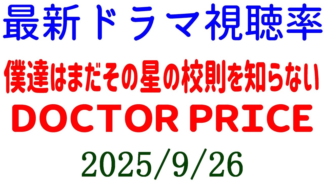 視聴率速報です。僕たちはまだその星の 高速を知らないの。第9話の視聴率が出て いました。2.6%だったようです。うん 。深夜ドラマ並みですね。はい。そして、 え、ドクタープライスの第10話の視聴率 が3.9%だったと情報が出ましたね。 はい。ま、飛び飛びにしか視張率出てない んですけど、まあ、一応ね、あの、視聴率 出てる分をね、更新させていただきました 。とですね、え、福山正治の沈黙の パレード9月、え、20日放送の視聴率が 、え、5.9%ね。あと、えー、それ ぐらいですかね。更新されてるのはですね 。はい。え、それぐらいですね。はい。と いうことでね、ま、視張率ね、はい。まあ 、全部出てないのかなっていうのはあり ますけどもね。はい。ま、更新させて、え 、いただきましたね。はい。ということで 速報でした。