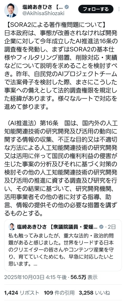 1:それでも動く名無し:2025/10/03(金) 22:28:19.98 ID:wBBvkgDa02:それでも動く名無し:2025/10/03(金) 22:29:15.03 ID:46b/Tisj0これはしゃーないと思う 4:それでも動く名無し:2025/10/03(金) 22:30:04.83 ID:rNERQmQx0日本の作品だけ生成し放題なの草 ディズニー様には逆らえませんってか 2ch2chblognews2ch
