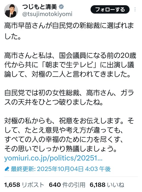 大同団結して、日本社会の右傾化を阻止するしかない。— 朝岡晶子 (@asaoka_akiko) October 4, 2025