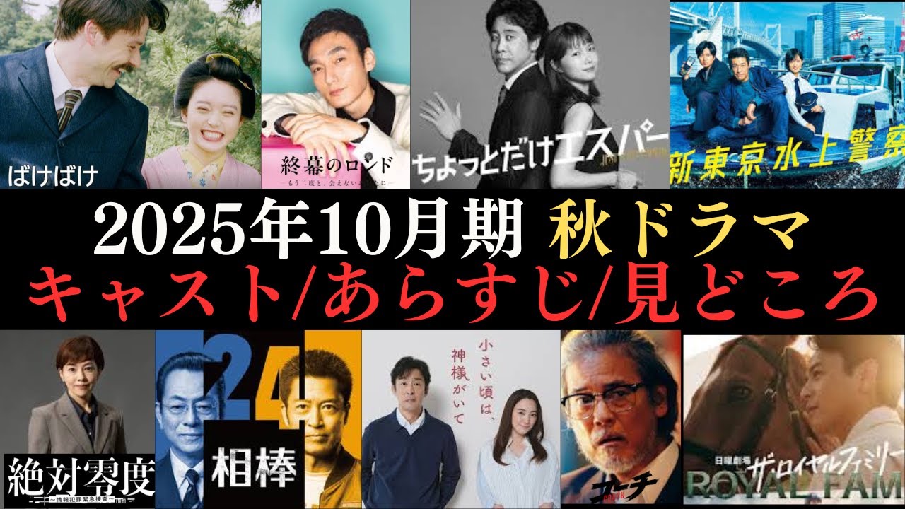 皆さん、こんにちは。2025年のドラマ シーンもいよいよラストクール。秋の夜長 を彩る今期も注目作&アド話題作が森沢さ 。今回は2025年秋に放送する注目の ドラマについてまとめてみましたのでお話 いたします。最後までお付き合いください 。2025年秋ドラマ月曜日絶対霊道情報 犯罪緊急捜査21時フジテレビ系10月6 日放送開始。沢口泰ヤ子さん主演人気 ドラマシリーズのシーズン5シーズン1で はコールドケースと呼ばれる未解決事件を シーズン2では潜入操作をテーマに女性 刑事桜木泉の活躍を描きシーズン3 シーズン4では元公案のエリート刑事沢 里島を主人公に未来の犯罪を予測して操作 する未然犯罪捜査班通称未犯の物語が描か れました。本作の舞台は情報犯罪匿名対策 室通称陸と高度な情報技術を悪用し、国民 の生命と財産を脅やかす情報犯罪の犯人 たちを負う捜査機関で匿名流動型犯罪通称 特流に代表される特殊詐欺やサイバーテロ など私たちの身近な生活から国家の安全を 脅やかす大規模な犯罪まで数々の情報犯罪 に立ち向かいます。注目のロンドもう2度 と会えないあなたに22時カテレフジ テレビ系主演草強さんが異品整理人役に 挑戦妻をなくし幼い息子を男で1つで 育てるシングルファーザーが異品生理会社 の仲間たちと共に時に孤独士現場の特殊 清掃や異品生理、さらには生前生理などを 通して様々な事情を抱える家族に寄り添っ ていくヒューマンストーリー シナントロープ23 テレビ系10月6日放送開始。水上さん 山田あさんらが出演。アニメオッド タクシーの脚本で知られるこの本和や氏が 原作脚本としてオリジナルストーリーを 書き下ろした本作。現代の若者たちを投映 したリアルな人間模様と不穏な世界観の中 で密な伏線や匠な会話劇によって美しく エモーショナルに描かれる青春軍像 ミステリー。恋愛と友情、絆と裏切り、 運命と選択、揺らぎ出した関係と感情が 次々と事件を引き寄せていく。アンリアル 不上理雑貨店25時5分テレビ大阪系10 月13日放送開始。ソや俊さん、小西エト さんダブル主演コミック片山収支&原作士 による漫画をドラマか。夢か幻か罪深き者 たちが集う不思議な雑貨店アンリアルを 舞台に男2人の強い絆と宿命を描いたデー ドリームファンタジー。放送後には舞台を 上映ドラマでは描かれなかったエピソード やその後の物語などが描かれます。悪いの はあなたです。25時29分読み売り テレビ系11月3日放送開始。工藤美さん 、山中郎さん、ダブル主演。文春オン ラインで累計3900万PVを獲得した 同盟漫画が原作。地味な荒沢派遣社員紐 バンドマン登場人物が絡み合い、愛像と 裏切りの果てに抜け出せない不倫地獄へと 転がり落ちていく。2025年秋ドラマ 火曜日ちょっとだけエスパー21時テレビ 朝日系10月21日放送開始。主演大泉 洋さとラストマイル脚本の乃木明が送る ジャパニーズヒーロードラマ。会社を首に なり人生積んだサラリーマンがちょっと だけエスパーになって世界を救う完全 オリジナルのSFラブロマンス。彼に重さ れた不利で不可快なルールは人を愛しては ならない。愛とは仲間とは世界を救うとは 。新場警察21時フジテレビ系10月7日 放送開始。出演キャストは佐藤龍太さん、 加藤茂明さん、山下水さん。原作は同盟 小説シリーズ日本のレドラ市場初の水場 警察が題在。刑事と水場警察署家のチーム が東京の海や川桶美で駆け巡り事件を追う 大迫力のマリンクライム エンターテインメント。じゃああんたが 作ってみろよ。22時TBS10月7日 放送開始。かほさん、竹内り馬さんダブル 主演同盟漫画が原作。プロポーズ直後に 別れてしまった恋人ファーストな女と低種 感な男のカップルが料理を作るという きっかけを通じ、当たり前と思っていた ものを見つめ直し成長していく再生 ロマンスコメディ。芝の起き手我ら犬編集 部22時NHK総合9月30日放送開始。 大東俊助さんよマリエさんダブル主演 ノンフィクション平成犬編集部が原作殺伐 とした夜なき令和の人間関係を癒し導くの は汚れなき心のお犬様芝居ぬ雑誌編集部を 舞台に絡まりもれた人の心を優しく 解きほぐしていく物語大東介さんは荒編集 長いよマリエさんはそんな彼と何かと対立 してしまう編集者を演じます。娘の命を 奪った奴を殺すのは罪ですか?23時 カンテレフジテレビ系10月7日放送開始 。斎藤京子さん水野美きさんが同一人物役 に同盟漫画が原作幼稚園のママ友いじめが 原因で娘をなくした55歳の母が全身で 25歳の新マに生まれ変わりママ友 グループに潜入する衝撃の復讐 エンターテインメント。そこから先は地獄 。24時24分日本テレビ系10月7日 放送開始。げ田博えさん主演3組の夫婦に よる地獄のような三角不倫。歪んだ愛でも いい狂った愛でもいい傷ついてもいいただ 誰かに愛されたかっただけ。そう願ってい た3組の夫婦が1つのマンションを舞台に 泥沼の三角不倫を繰り広げる現代的な家庭 問題を題材にした愛像劇の卵24時58分 TBS10月7日放送開始奥山青井さん 主演週刊誌に