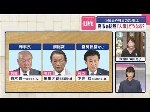 政治部与党キャップサ直記者に高一新総裁の人事について最新情報を聞いていきます。 はい、よろしくお願いします。 お願いします。まずは佐井さん、先ほど高一新総裁が自民党本部に入ったということですが、今まさに中で人事の構想を練っているということなんでしょうか? そうですね。高一さん、先ほど5 時前に自民党本部に入りまして、麻顧問も同じ頃に東本部に入ってますので、おそらく 2 人きりで東員や訴訟などの人事構訴を今練っていると見られます。 この注目の人事最新情報を教えてください。 はい。幹事長には麻住の鈴木俊春俊一総務会長を当てる方向で調整に入りました。 また麻生最高顧問を副総裁として起用する ことを検討している他、木原る全防衛大臣 を官房長官などの養殖で起用することも 有力となっています。仮にこの3人を起用 するとして高一さんの狙いは何なん でしょうか?そうですね、高一さんとして は自身の後ろを作りたいという考えのよう です。というのも高一さんはこれまで東内 基盤が弱いことを弱点とされてきました。 今回決戦投票で麻生さんが2回目は党員 投票で多い方、つまり高一さんという方針 を示して高一総裁誕生の流れを作りました 。ま、政治の世界は論交渉の面も大きい ですし、高一さんとしては後ろとして麻生 さんに政権のど真ん中に入ってもらいたい と考えているようでして、麻生さんの義の 弟にあたる鈴木さんを幹事長に、そして 麻生さん自身も副総裁2との狙いがあると 見られます。また木原さんは旧モ木派で 保守派のホープと言われていて、4年前の 総裁戦では高一さんの推薦人の1人にも名 をつらねていました。 そして気になる昨日総裁戦を共に戦った4 人の候補についてですね、高さんは昨日 全員活躍してもらうと話していましたが、 養殖への起用はあるんでしょうか?そう ですね、挙闘体制を作るためにも4人全員 に一定のポストを打進すると見られます。 特に決戦でまとまって高一さんに投票した モテさんは重要閣僚などの養殖で起用して 同じく小林さんを閣僚化東部で起用される と見られます。一方の林官房長官ですが、 え、総裁戦期間中に唯一麻生さんと面会し ていないことからも分かるように新態とは 距離があります。はさんを昨日あの地方 周りができる要殖なら受けるがそれ以外 なら引き受けずに次を目指すという風に 話していたということなんです。小泉さん についてはまだどうするのか情報はあり ませんが自民党関係者からは脳水大臣の 続頭がベストなのではとの声も出ています 。え、高一新総裁は明日 7 日までに人事を固める方針だということです。ここまで騒者の中継でした。 の人出てくれ。 [音楽] [拍手]