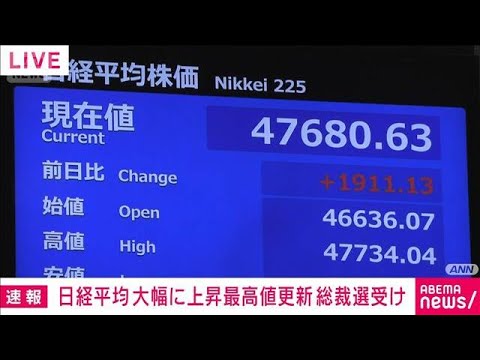 日経平均株価 先週末比1000円超上昇 史上最高値更新 自民党総裁選の結果受け(2025年10月6日)