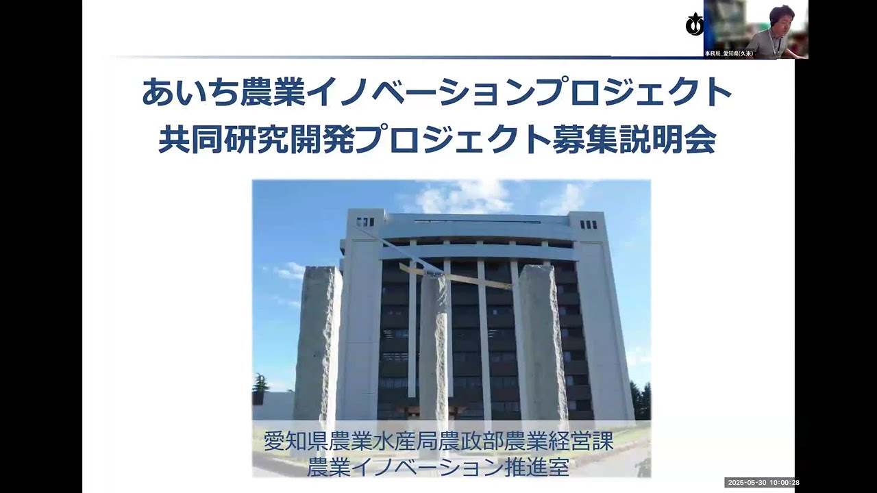 はい。え、皆さん、え、おはようござい ます。え、聞こえてますでしょうか?え、 これ、え、本日はですね、皆様お忙しい中 、え、愛知農業イノベーション プロジェクト、え、共同研究開発 プロジェクト募集説明会ということで、え 、ご参加いただきまして、え、ありがとう ございます。私は、え、事務局を担当して おります。愛知県庁、え、農業経過農業 イノベーション推進室、え、 イノベーション推進グループで繁長を務め ておりますと申します。どうぞよろしくお 願いをいたします。それでは、え、本日の 、え、説明会を開催するにああたりまして 、まず始めにですね、主催者を代表いたし まして、え、農業 イノベーション推進室長の奥義からご挨拶 を申し上げます。長、よろしくお願いし ます。はい、それではよろしくお願い いたします。え、農業経営農業 イノベーション推進室の、え、出張の 荻木野です。え、本日はあの愛知農業 イノベーションプロジェクトのですね、え 、共同研究開発プロジェクト募集説明会に 、え、ご多ぼの中ご参加いただきまして誠 にありがとうございます。愛知農業 イノベーションプロジェクトでは、え、 農業分野、え、課題解決に向けて、え、 農業総合試験上と、え、スタートアップや 、え、大学などが共同研究開発により、え 、革新的な技術の開発と新しいビジネス モデルの喪失に、ま、2021年度から、 え、挑戦しています 。これまで、え、2022年度に、え、 農業総合試験上と、え、共同研究開発を 取り組む18課題を選定し、え、2023 年度から本格的に共同研究開発を開始して きました。この度、え、2026年度から 、え、共同研究開発を開始する、え、 プロジェクト2026新たに立ち上げる こととし、え、スタートアップや、え、 民間企業、え、それから、え、大学など 様々な方から、え、技術提案の募集を 受けることとしまして、え、5月20日に 記者発表を行い、募集を開始したところ ですと、本日の説明会では、え、技術提案 の、え、募集内容や条件、募集テーマの うち、え、農層士が、え、実施する、え、 新研の内容について、え、参加している皆 様にご説明することでプロジェの内容を、 え、しっかりご理解いただくとに幅広く 効果的な技術提案の応募につなげて いただきたいと考えております 。本日の説明会が、え、皆様の、え、応募 の際の参考となり、多くの方々から技術の ご提案をいただくことが、え、農業現場の ですね、課題解決の近道と考えております 。本日の、え、説明会を受け、え、皆様 からのより、え、確信的で計画的で、ま、 より普及性のある多くのご提案をお待ちし ておりますので、え、積極的な、え、応募 の方よろしくお願いいたします。 え、以上簡単ですが挨拶をさせていただきます。本日はよろしくお願いいたします。 はい。え、奥木の出張りました。それでは 、え、早速説明に、え、移させていただき たいという風に思いますが、え、本日の 流れでありますけど、まず最初にですね、 え、プロジェクトの、え、概要について、 その次に、え、今回のあの技術提案のです ね、募集に関する、ま、募集要件等につい ての説明、それから、え、採択された、ま 、スタートアタップ等の企業様と共同で 研究開発をいたします。え、愛知県農業 総合試験上の概要についてのご説明でその 後にですね、今回、ま、愛知県といたし まして私とも県からあの皆様から募、あの 技術提案の募集を受けたい、ま、テーマと いうのをあの募集人ですね、お示しさせて いただいているわけでございますが、その テーマ、あの、ま、テーマですね、テーマ についてのですね、この研究の内容、課題 感と言いますか、ま、どういったテーマ、 テーマの内容についてですね、あの、少し ご説明をさせていただきたいということで 、ちょっと説明がですね、あの、全体長く なってしまますが、一通り聞いていただい た後に、え、皆様からの質問に対する回答 をですね、え、させていただきたいなと いう風に思っております。本日、あの、 農業総合試験上のですね、配信会場には、 え、関係するテーマに関係する、ま、農業 総合試験上の研究員もですね、あの、待機 しておりますので、あの、しっかりとです ね、お答えができるかなという風に思って おりますので、汚いご質問いただければと いう風に思いますので、どうぞよろしく、 え、お願いいたします。なお、あの、質問 はですね、ちょっと説明時間長くなって おりますので、え、気づいた時にですね、 もうすぐにですね、あの、説明で構えませ んので、このウェビナーの1番下のとこに ございますQAというところを、ま、 クリックしていただきまして、そちらに 入力、送信していただきますようお願いを いたします。回答自体は全ての説明が 終わってから一括で行いますが、あの、 質問自体はですね、どんどんどんど入力し ていただきたいなという風に思っており ますので、どう