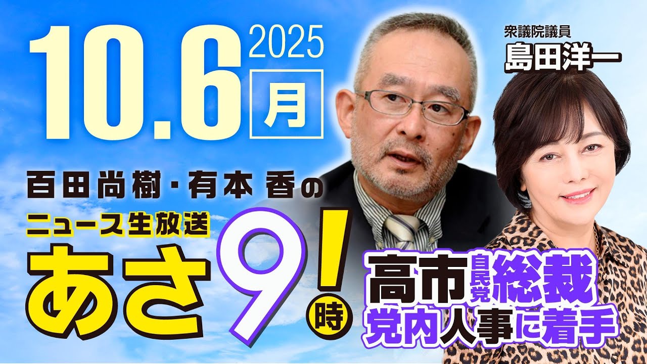 [音楽] おはようございます。リポナ朝9時です。 令和7年10月6日月曜日ニュース放送 朝今朝は9時です。え、今朝けれども この方をお迎えしております。 え、日本と衆議院議員の島田洋一先生 おはようございます。あ、おはようござい ます。よろしくお願いします。よろしくお 願いします。 月曜日ですね。え、ま、の月曜日は百太代表がリモートで出るという 寸法のことが多いんですけれども、え え、今日はM1で、 今日はもうM1 二次予選ですからね、あの忙しいと、ま、こういうことでございます。 で、 はい。 先生、あの金守法時代の坂倉みたいな背景で、 ええ、あの、逮捕されてんじゃないかというね、あの、え、噂もありますけれども 先生禁止法時代だったら大変ですね。 ええ、まあまあ、あの、今、あの、福井の方からね、あの、オンラインで繋いでるんですけれども、 ま、あの、何の色気もないタンスが後ろにあるよりはね、これの方が なるほど。 怪しげてはあるけれども ということでバックをそのようにされているとこういうことですね。 はい。はい。ええ。 はい。 先生、あの福井は 今気候的にはどうなんですか?私たち先週末沖縄行っててで沖縄暑かったんですよ、実は。 うん。なるほどね。あのこの、え、 2 日ほどちょっと雨が降ってましたけれども。 あ、そうですか。え え。やはりあの急速にね、涼しくなってきてんなと。こっちの方はね。 え、そ、ちょっと、ま、私、ま、早く夏が来ないかなと思ってるんですが、 先生暑いの平気なんですね。 うん。というかね、あの、やっぱ福井はね、あの、雪が降るとそうですね、 [音楽] あの交通にね、え、市場が出て、え、例えば家のあのガレージからね、え、この道路に出すのが、ま、雪とかで大変だったね。 [音楽] あ、はい。ええ。 うん。だからやっぱりあの冬がね、困るなっちゅ感じがありますね。 [音楽] うん。確かにそうですね。 ま、車会でもありましょうけれども、その車とてね、あまり雪が多いとやっぱ大変ですもんね。出ていくのが。 そう。あの、一般道はね、あの、朝早くから除者が来てね、 え、対応スなんですけれども、やっぱ自宅から一般道に出るまでのところはね、あの、その各自がやらないといけないんでね。 うん。 うん。やっぱりだから私は夏の方がありがたいですけどね。 ああ、そうですね。 あの、車社会でしょうけれどもって先ほどもね、ま、申し上げたんですけど、え、 [音楽] これだんだん落年寄りのお年寄りだけの世帯とか増えてくると うん。 大変ですよね、 これ。 だから、あの、ま、自動運転の車とかがね、え、これから実用化されると はい。うん。 あの、ま、年寄りでも、ま、要するに車で、え、こう出かけたりできるわけですが、 [音楽] だけその雪がツもったりしてるとね、 やっぱこう自宅から一般道で出るまでのところていうのは、 そうですよね。ええ。 うん。これ、それこそ、ま、あの、 AI の雪ロボットとかがね、え、あの、普及してくれば別ですけれどもうん。はい。 うん。やっぱそこの大変さっちうの残るでしょうね。 うん。うん。 そうですね。だから本当に車運転の前に雪かきですね。雪かきロボット。これは本当にあるといいですね。 そうですね。あの冬場に関してはね。 うん。やっぱそこも同時に自動化されないとね。 そうですね。本当ですね。 え、年寄りは困るっちゅう感じなんじゃないですかね。 はい。 ということでですね、あの今日は一応サムネールにですね、 [音楽] あの、ま、高一さんが色々祖と言いますか、ま、人事を始めたっていうことをちらっとこう書いているんですけれども、 高一自民党総裁が東内人事に着手と、ま、この週のニュースが結構ありますし、ま、先生も私もですね、 あの、ちょっと、ま、生で色々と聞いている情報などもですね、え、一部 で、え、話をしながらということになると思うんですけれど。 はい。 そうですね。はい。 それではですね、今日のニュースのラインナップご紹介します。 1 高一市の経済政策は物価高対策を最優先。 2 ガラスの天井を破った高一氏平等が交代。 え、何言ってのの懸念も3公明斎藤代表 連立離脱をほのめかす高一氏の総裁就任に 4自民役員人事鈴木春俊一氏を養殖で調整 幹事長案も浮上もう幹事長だという風に 結構決め打ちしてるメディアもありますね 共同通信馬車馬国民には市内で高一発言が 波本 6高い地震相裁に本気で立ち上がって 欲しい八族ら。7ハリーポッターの作者。 え、映画の出演者を無知と一周政治人に 対する意見の違い。8優秀なアフリカ人の 留学生取り込みを外務省。9高校無償化人 生徒も対象そうなんですよね。これが問題 だと思いますけどね。市民公明維新3 党の実務者協議 10 百代表が高一知市に意スパイ防止法は協力移民を見直さねば追求とこの 10項目で今日はお送りしたいのですが、 え、やはりどうしてもその新裁が高さんになったという関連のニュースが多いんですけれども う