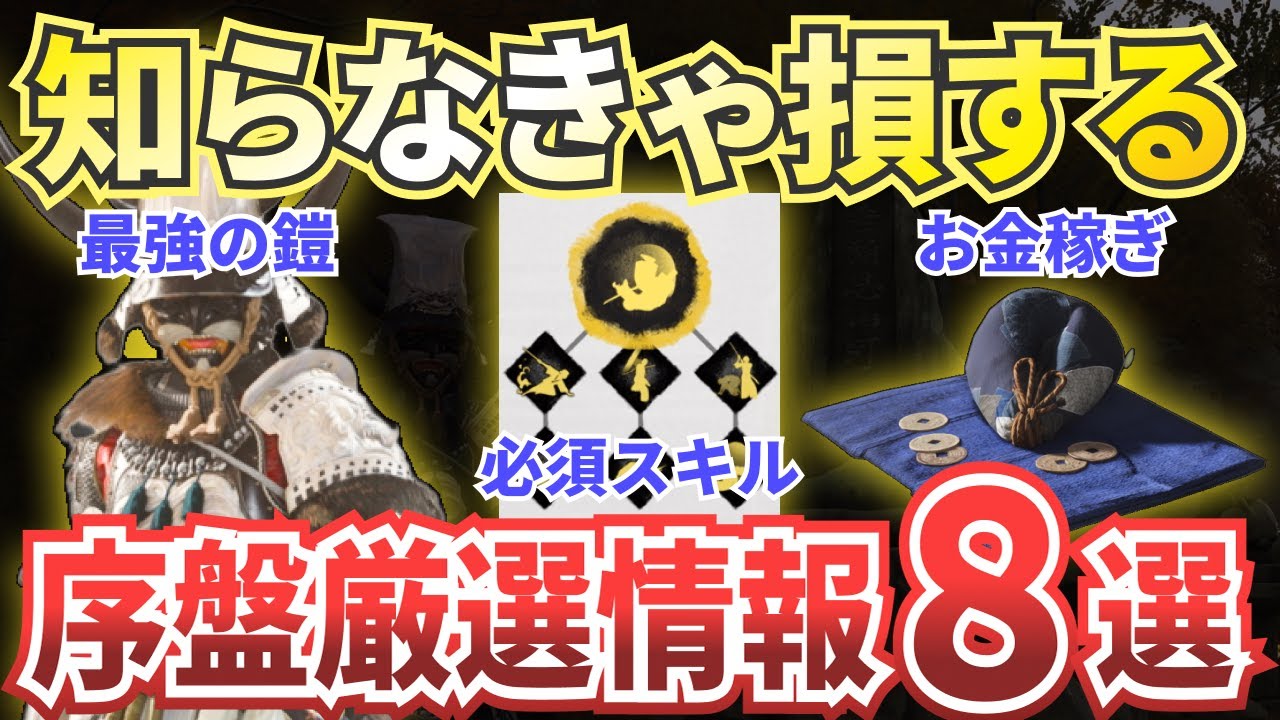 こんにちは。80丸です。この動画では 知役立つお得情報や最後まで使えるおすめ 装備アイテムの入手方法を解説しています 。ずっと役に立つ情報なのでゲームを始め たばかりの方はもちろんもう終盤の方も 是非見ていってください。動画の説明欄に 内容をまとめておくのでよかったらそちら も参考にしてみてください。それでは早速 解説をしていきます。まず最初におすめな のがこの法場のマが玉っていうご歩ですね 。効果は木材、花、その他の植物の入手量 が増加するっていうものなんですけど、 武器や装備を強化するのにこれらが非常に たくさん必要になるので、なるべく早い 段階から装備しておくとストーリー進め てるだけで自然に素材が集まるので武器が 強化しやすくなると思います。なるべく 早く手に入れて僕はもうずっと装備して ました。法場の入手方法します。 この成果下からですね、西の方へ行くとこの古マ屋というのがあるのでまずここを訪れます。で、ここにいる人に話しかけていくとイベントが進行します。 に何かようか。 馬屋のアジが そうすると56 人敵がやってくるのでこいつらを全滅させましょう。 で、また進行するとこんな感じでね、馬を選ぶイベントが発生します。 で、この時取り忘れちゃった方もね、この場所に来れば置いてあるので取りに行きましょう。疲れた 木の根元ですね。海装の時にお父さんが置いてた布ですね。こちらを回収しておきましょう。こんな感じで入手できます。このご歩を取り忘れてしまった方はこの古屋から西に行ったところ、この藤見の人とかねがあるこの四骨の森から少し南行ったとこ、ここの湖の周りにありますので行きましょう。 次に紹介するのがこの金屋神のご歩ですね 。こちらムアサりで得られる金属と火薬の 獲得数が増えるというご歩ですね。さっき 紹介したこの法上のまが玉が木材花その他 植物だったのに対してこれは金属と火薬 ですね。武器や装備の強化に金属や火薬が 大量に必要になるのでなるべく早く入手し ておくと良いかなと思います。僕はこれを 取るのが遅くて火薬が足りなくなりました 。5歩の入手方法解説します。この沢神社 に行くんですけど、陽の自分の成果から ですね、このまっすぐ南に行ったところ、 ここに沢神社、成沢神社ですかねの入り口 があります。ここからどんどん先に進んで いくだけですね。戦闘もありませんので なるべく早く来てご歩を入手しておくこと をお勧めします。おすめの金索、お金稼ぎ の方法2つ紹介します。1つはよくある このね、手配書ですね。この手配書を取っ てですね、取ると地図上にこんな感じで 例えばこいつの場合緑が丘に出るよとか こんな風に地図上にね黄色い文字が表示さ れるようになるのでここに行って衝撃金首 を倒してまた戻ってくるとそうすることで お金を効率よく稼げます。ちなみにこの 手配書はですね、一通り取ってしまった後 にマップを開いてもう1度この 手配書の前にファストトラベルして戻って くるともう1回新しい手配書が張り出され てますのでまた出なくなるまでですね、何 回も繰り返しこうやってですね、また ファストトラベルして出てる分は全部 剥がすとやってしまうといちいち取りに くる必要がないので最初に全部取っちゃう と楽かなと思います。手配書はですね、 新しいエリアに行くごとにまた新しい手配 書が掲示されるようになってますので、 新しいエリアに移動したらまたね、確認 するようにすると良いと思います。金索お 金稼ぎの方法2つ目と銭の勝率を上げる 小技の紹介をしたいと思います。スタート 地点の成果から南性のですね、この くったらのとばってとこに移動してですね 、ここの中にあるお金をかけて勝負する 銭きで遊ぶっていうね、え、場所があるん ですけども、ま、これ1回目は1000問 とかかけられるんですけど、僕は何回か やっちゃったんで570問に減っちゃっ てるんですけど、ま、それでも、ま、最初 のうちはね、いいお金稼ぎになるかなと 思います。このト場で行えるミニゲーム 銭に弾きはすごく難易度が高いんですけど 、銭を弾く強さを表示する設定にすること で内度を劇的に下げることができます。 設定の仕方を紹介します。まずメニュー 開いて1番右の設定のこの補助機能を選ん でここの少し下の方にこの銭に弾き距離 表示っていうのがあるのでこれをありに 設定します。そうすることで弾いた時の飛 距離っていうのを卓上に表示することが できるようになります。よかったら試して みてください。トばもですね、新しい エリアに行くと新しいトばが出てきたり ですね。トをクリアするとまた新しいご歩 がもらえたりなんてこともあるので是非 攻略してみてください。次におすすめなの がこちらの鎧いですね。これはとこよの 鎧いという装備なんですが性能は特攻武器 で敵をよめかせやすくなったりよめかせる と体力が回復したりあとは受け流し5の線 の極意の判定時間が伸びると