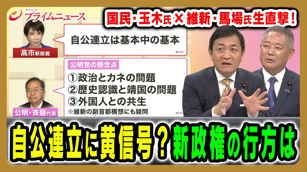 自民新総裁に高市氏が選出された。今後の政権運営のカギを握る維新・国民の対応は。国民・玉木代表と維新・馬場顧問の自民との連立・連携に向けた本音に迫る。