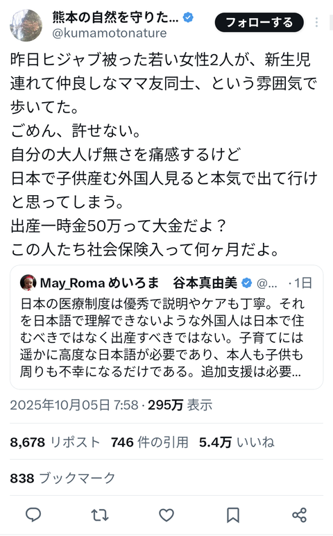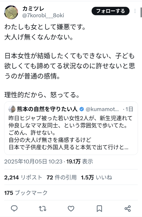 1:それでも動く名無し:2025/10/06(月) 12:33:21.53 ID:xJN92HkFd日本女性が結婚したくてもできない、子ども欲しくても諦めてる状況なのに許せないと思うのが普通の感情 2:それでも動く名無し:2025/10/06(月) 12:34:20.46 ID:ozKC8CICd……ただの個人的な嫉妬では? 2ch2chblognews2ch