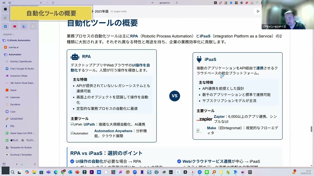 [音楽] 今日はですね、え、AIツール、自動化を 選ぶ上で、ま、どんなことを参考にするか ということで、ま、簡単にちょっと プレゼンまとめたので、え、お話ししたい なと思います。えっと、ま、主に3つです ね。大規模言語モデル、ま、 いわゆるチャATGPTのようなもの、 それから画像生成AIで自動化というか、 この3つのカテゴリーでお話をしていき ます。 はい。え、目次ですけども、大規模言語 モデルLLMですねの比較、それから画像 生成AIの比較ですね。それから自動化の 比較という流れになっています。ま、比較 の観点なんですけども、性能コスト、 API連携、API連携っていうのは、ま 、他のシステムからその言語モデルを 呼び出してで、指示を与えて回答を得ると いうようなもので、ま、後から出てくる ような自動化なんかでこう連携させる時に 使うものです。え、あとは進化のスピード 、安全性、それから性格性ですね。え、ま 、こういったものを、え、一通り見ていき たいなと思います。 で、ま、ここに書いてるように、あの、 性能コスト、API連携、進化のスピード 、データの安全性、性格性という、ま、 大体この6つぐらいが、え、比較の、ま、 基準となるかなという風に思います。で、 LLMの概要なんですけども、ま、主に この自然言語処理ということで、ま、文章 を理解してそれに対して回答を出力すると いうのが主な役割となりますけれども、ま 、その応用としてこの翻訳や要約に非常に 優れている、あるいは、ま、内容を膨らま せたりとかすることにも優れているという 点もあります。え、対話システムとして、 ま、マルチダルと言って音声だとか文字の 入力、え、それから、ま、いろんな ファイル形式ですね、ビデオや音声も含め たファイル形式に対応するというような ところが今進んでいます。え、 コーディングですね、プログラミングの 能力がも日法でどんどん高まっていて、え 、ま、最近はクロードが1番いいという風 に言われてますけども、え、ま、あの、 いろんな意味で素人でもコーディング できるような、え、時代になってきたなと いう風に思います。あとは検索能力ですね 。ま、Googleで検索をしてるのとは 違ってもう少しこのAIらしい判断を加え た形で、え、ま、例えば牽引性のあるうん 、サイトを参照するとか、信頼性の高い サイトを参照するとかという風に、ま、 ある程度考えて、え、参照先を選ぶという ことができますし、え、ま、少し多めに、 え、検索をしてその中から必要な情報だけ を抽出するというようなこともできます。 え、それから専門知識ですね。え、ま、 分野特化支援というのがあって、ま、その 中には、え、事前に資料を読み込ませて、 え、それを理解した上でその資料の中から 情報を出力するというようなことも可能 ですし、え、ま、AI自身が持ってるこの ノウハウと、え、あとはその場で行う検索 、検索によって、ま、得られる情報といっ たようなものが含まれます。ま、これらも 以前は1年半前だとか2年前とかっていう 知識のレベルだったのがどんどんが最近の 情報まで入ってきているということで リアルタイムの情報が得られるサイトも 増えてきています。で、ま、代表的な LLMのモデルとしてはこのチャAT GPTですね。え、ま、GPT4っていう のが、まあ、1番最新の、ま、モデルと いうことになるんですけれども、ま、これ 以外にもそのチャATGPTのO3という なのは、え、より水論をの能力にたけた ものなどもあります。え、JMに GoogleのJOMに1.5Pro、 これちょっと古いですね。2.5Proが 今最新になります。ま、ジェムニも どんどん進化していて、そのdeep リサーチという風に、あの、ま、それぞれ ディープリサーチあるんですけれども、え 、ま、参考になる論、ま、サイトを数十個 、え、検索してその中の情報を得て、え、 レポートをまとめるみたいなことが、え、 要因にできるようになりました。え、 クロード3の、え、オーパスですね。これ も、え、オスっていうのはこの3の中の 1番最高 ランクのモデルということになるんです けれども、え、ま、これについても どんどん進化があります。この中で、え、 特徴としてはジェムニーが比較的こう長い 文章に強いというようなところが、ま、 特徴としてあります。ただ、まあ、この3 つはもう、え、ほとんど、ま、日月で どんどん進化していってるというのもある し、ま、それほど差を見い出すのが難しい というような状況にもなりつつはあります 。え、ま、性能比較の表なんですけれども 、ま、総合性能GPT4は非常に高い、え 、テキスト、音声、画像、動画ね、統合的 に処理するネイティブなマルチモーダル 性能。ま、あの、例えば、え、GPT4で 音声入力をすると、え、例えば英語で入力 すると英語で返してくれたり、ま、それが 会話として成立したりというようなことも できるようになってきました。で、ジェミ も最近2.5になって、あの、音声入力に 対応するようになっ