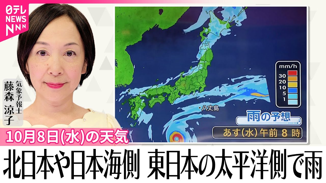 [音楽] 今日は北海道から冬の頼りが届きました。 北海道の立シで初関節を観測したんですね 。一方今日も西日本を中心に全国の140 の地点で真夏日を観測しています。今の 日本列島は冬と夏が同居している状態なん ですね。旅行などに出かける場合には服装 にご注意ください。では、台風情報です。 [音楽] 台風22号は今夜は日本の南会場にあり ます。この後新北から東寄に変えそうです 。明後日には勢力を維持したまま伊豆諸島 に接近する見込みです。伊豆諸島は明日は 非常に強い風が吹き会場は大しとなる でしょう。明後手には一部の家が東壊する ような猛烈な風が吹く恐れがあります。 猛烈な風や波に厳重に警戒してください。 では今後の雨雲の予想を見てみましょう。 明日は前線の影響で北日本を中心に雨が 降りそうです。また日本海側も所々で雨が 降るでしょう。そして南海場からは台風の 雲が北上してきます。この台風が前線の雲 押し上げてくるんですね。東日本の太平 洋側でも雨の降るところがありそうです。 各地の予報詳しく見ていきましょう。 西日本です。太平洋側を中心に日差しは出 ますが雲も多く日本海側では雨の降る ところもありそうです。日中の気温は今日 と同じかや低くなるところが多いでしょう 。東日本です。各地とも雲が多く太平洋側 でも日本海側でも雨が降りそうです。内陸 部では日差しの出るところがありそうです 。北日本です。東北は朝から午前中を中心 に雨が降りそうです。北海道も雨が降っ たり止んだりでライになるところもある でしょう。朝の気温は北海道で今朝より 大幅に高く冷え込みは緩みそうです。週間 予報です。大阪から那覇です。半は木曜日 頃まで晴れますが、土曜日から月曜日の3 連休は雨となりそうです。その他は来週 月曜日頃までは晴れて九州や四国は真夏に なる日もありそうです。新潟から名古屋 です。木曜日にかけてすっきりしない天気 が続くでしょう。木曜日は関東でも風が 強まりそうです。金曜日は晴れますが気温 は上がらず最高気温は25°下回るところ が多いでしょう。旭川から福島です。 北海道は木曜日朝の冷え込みが強まりそう です。土曜日の朝は旭川で1度まで下がる でしょう。東北は日曜日と来週火曜日は雨 が降りそうです。以上処法お伝えしました 。